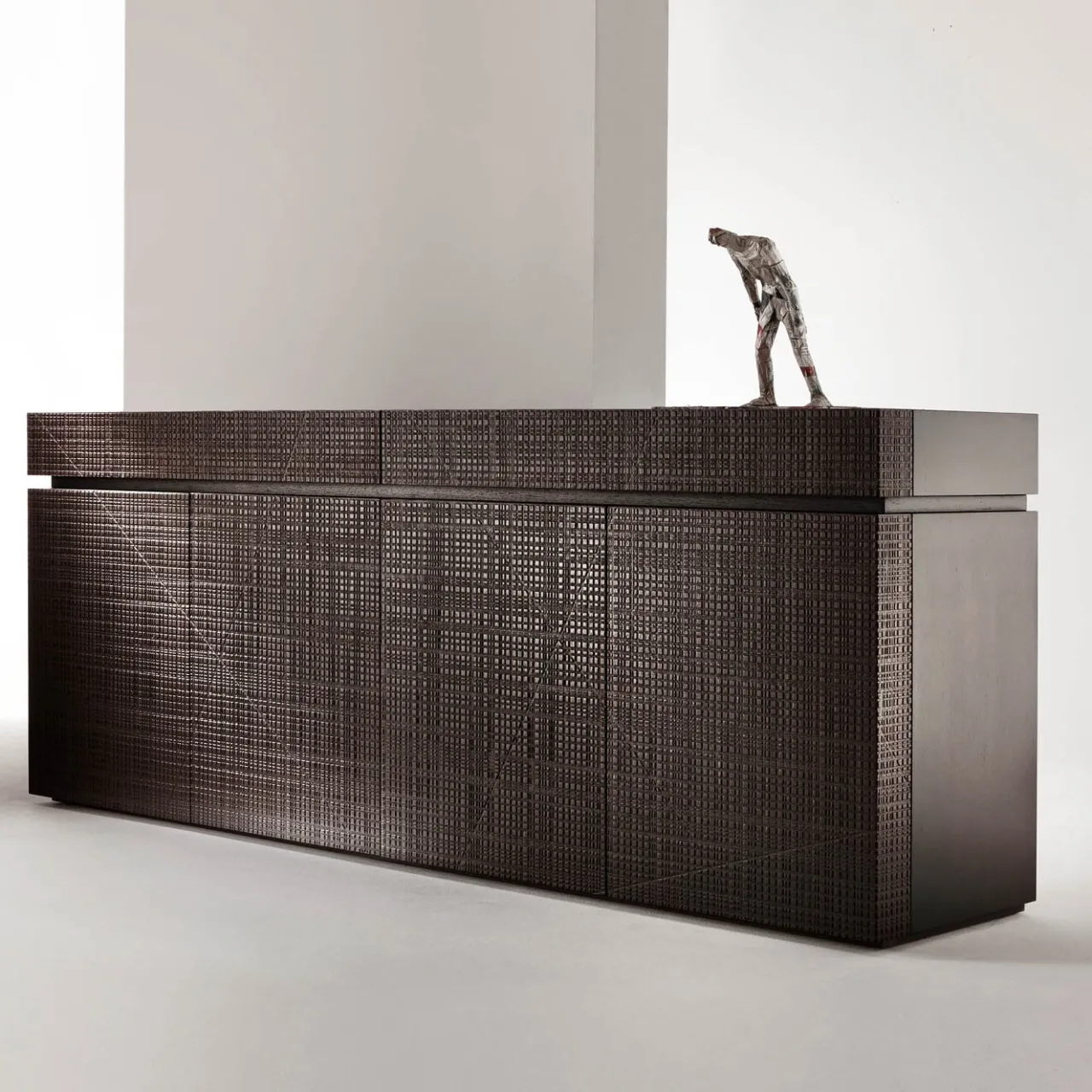 Credenza in legno con 4 ante a battente intagliate Maxima e 2 cassetti. Struttura interna e fianchi in legno liscio. Ripiani interni in legno.