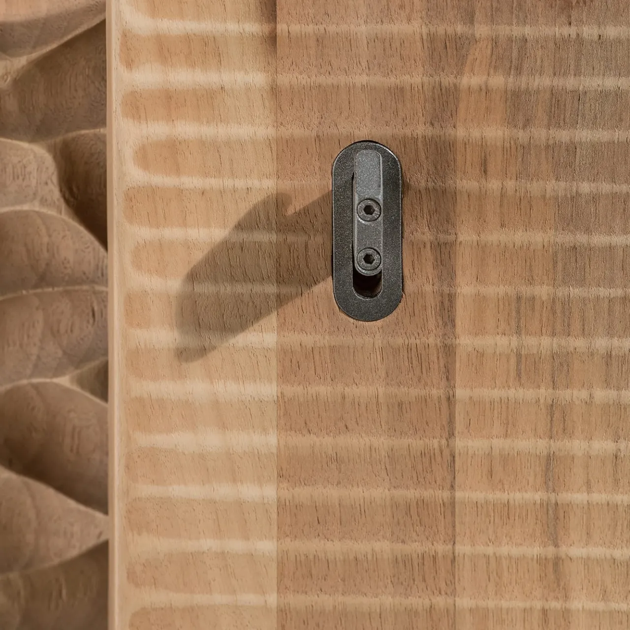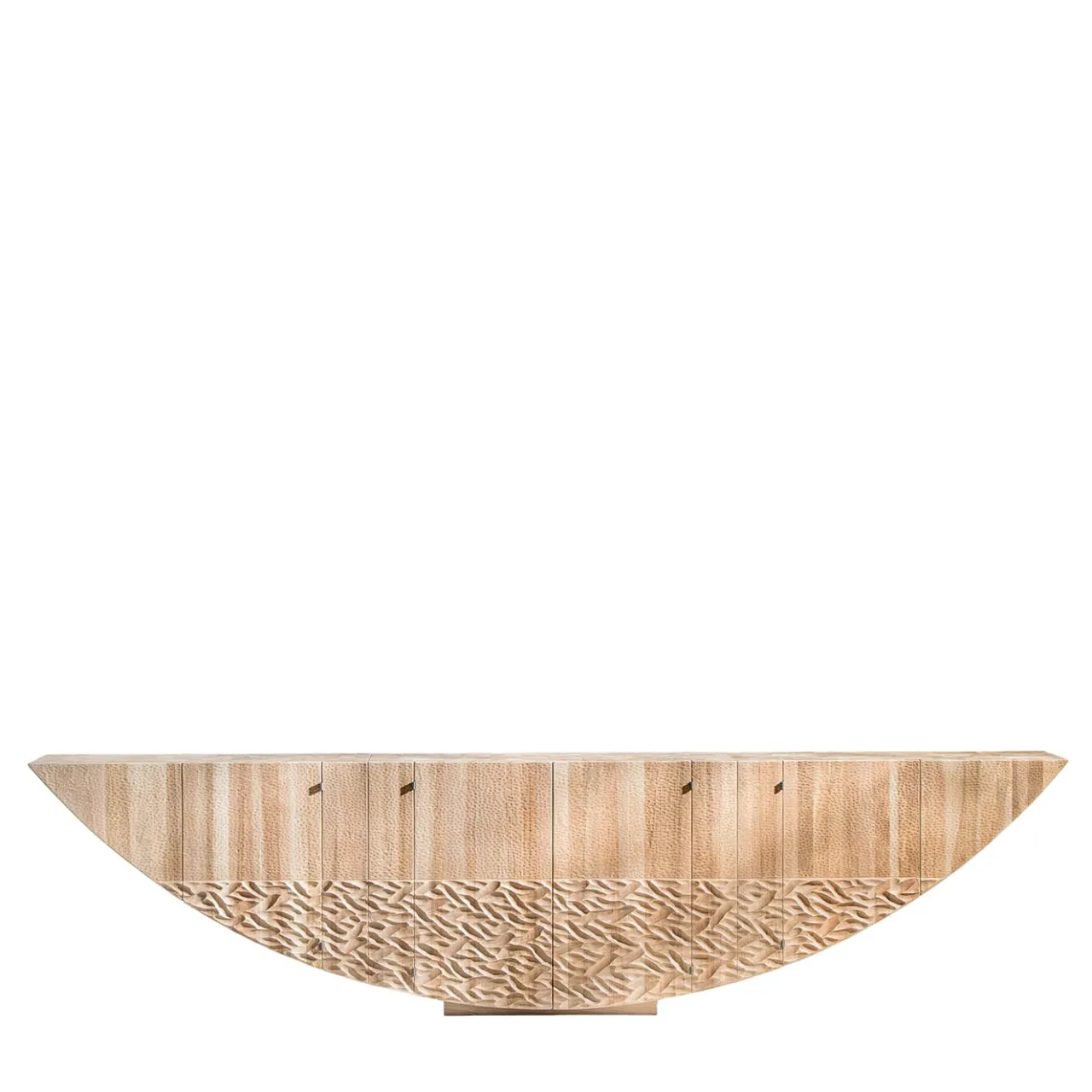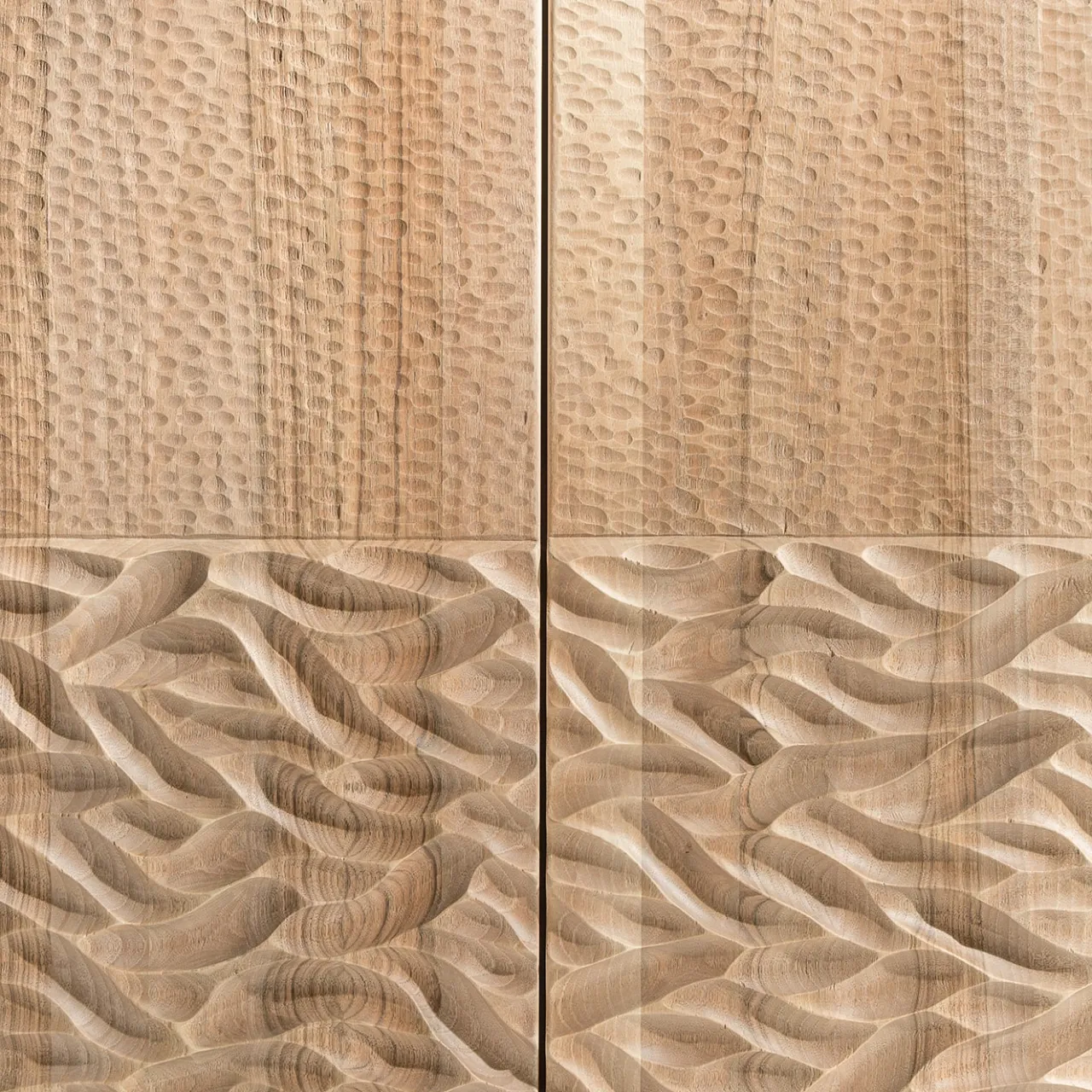 Contenitore monolitico a quattro ante, costruito con fibra verticale. Superfici intagliate con una sgorbia (due diverse texture sulle facciate). Bulloni nascosti e cerniere a vista in acciaio brunito.