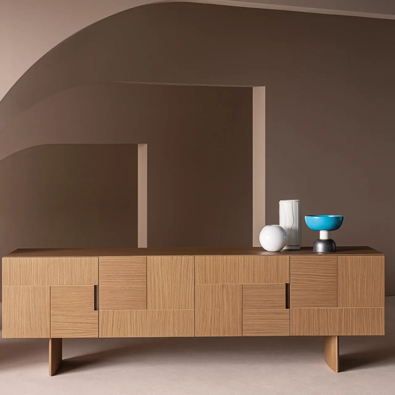 L’elegante credenza presenta una struttura in legno color noce miele. Il piano è realizzato in essenza in tinta, mentre l’interno vanta un ripiano in vetro temperato color bronzo. Il cassetto interno è rifinito nella stessa impiallacciatura, con meccanismo “Bluemotion” a chiusura ammortizzata e cerniere in acciaio brunito. La maniglia laccata color ottone aggiunge un tocco raffinato. Un connubio perfetto tra funzionalità e design di lusso per qualsiasi spazio moderno.