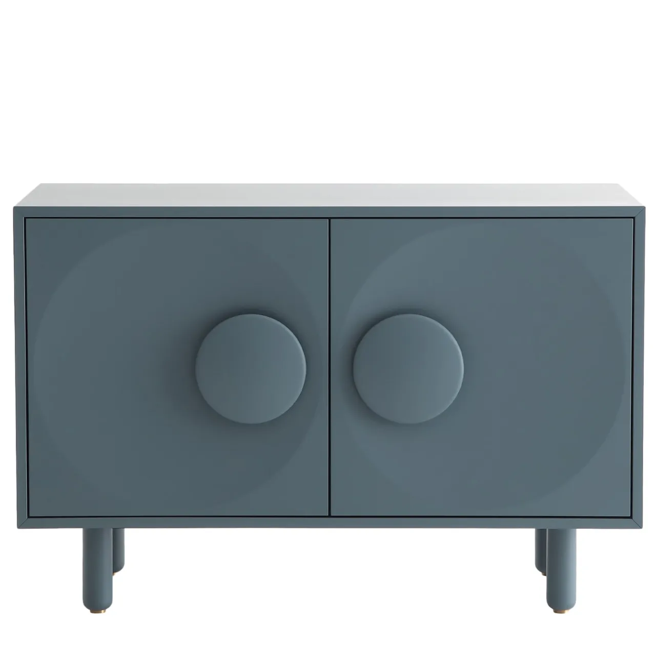 Questa credenza compatta è caratterizzata da maniglie a bottone che emergono da leggere depressioni, dettagli che celebrano la tendenza francese degli anni ’20 a concedersi ai bottoni. L’elegante tonalità blu denim è stata scelta come vernice generale per la struttura in MDF e per i piedi in legno massiccio torniti che, impreziositi da punte in ottone, assicurano un sostegno impeccabile. Un ripiano in vetro fumé e un cassetto impiallacciato in rovere scuro arredano l’interno.