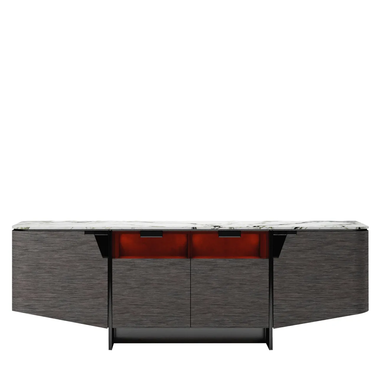 La credenza Bellatrix è caratterizzata da un raffinato piano in marmo e da una finitura effetto legno, con due ante laterali dotate di meccanismi push-pull. La sezione centrale, impreziosita da frontali in vetro, rivela due vani interni rivestiti velluto rosso e illuminati da barre LED integrate. L’intera struttura è sollevata da una base in acciaio e offre ripiani interni per una funzionale capacità di stoccaggio. Completamente personalizzabile, il pezzo è disponibile in una vasta gamma di finiture tra cui pelle, tessuti, legni, metalli, marmi e vetri. Per ulteriori informazioni, si prega di contattare il Concierge.