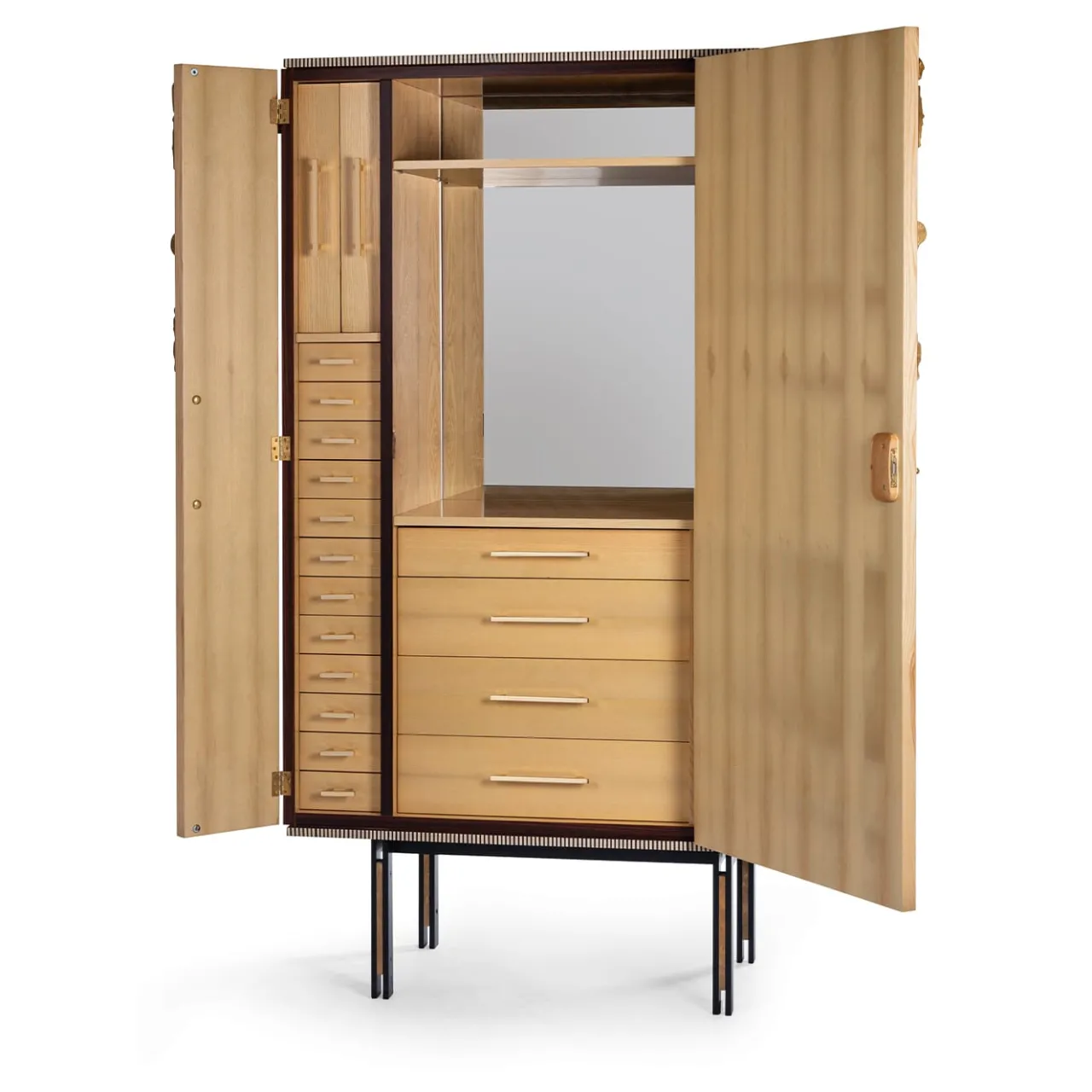 Il tema contemporaneo del divenire, dove i cambiamenti non significano perdita di identità ma evoluzione positiva, ispira la madia Bon Sai, i cui riferimenti stilistici sono orientati al XX secolo. L’intarsio a forma di ramo ricorda un bonsai, simbolo di un costante cambiamento creato dall’uomo. Questa credenza alta è realizzata in frassino intarsiato con erbaceo sbiancato, ebano e foglia d’oro. Le gambe sono in ferro nero spazzolato e i dettagli in bronzo massiccio. Design interno personalizzabile con ripiani o cassetti.