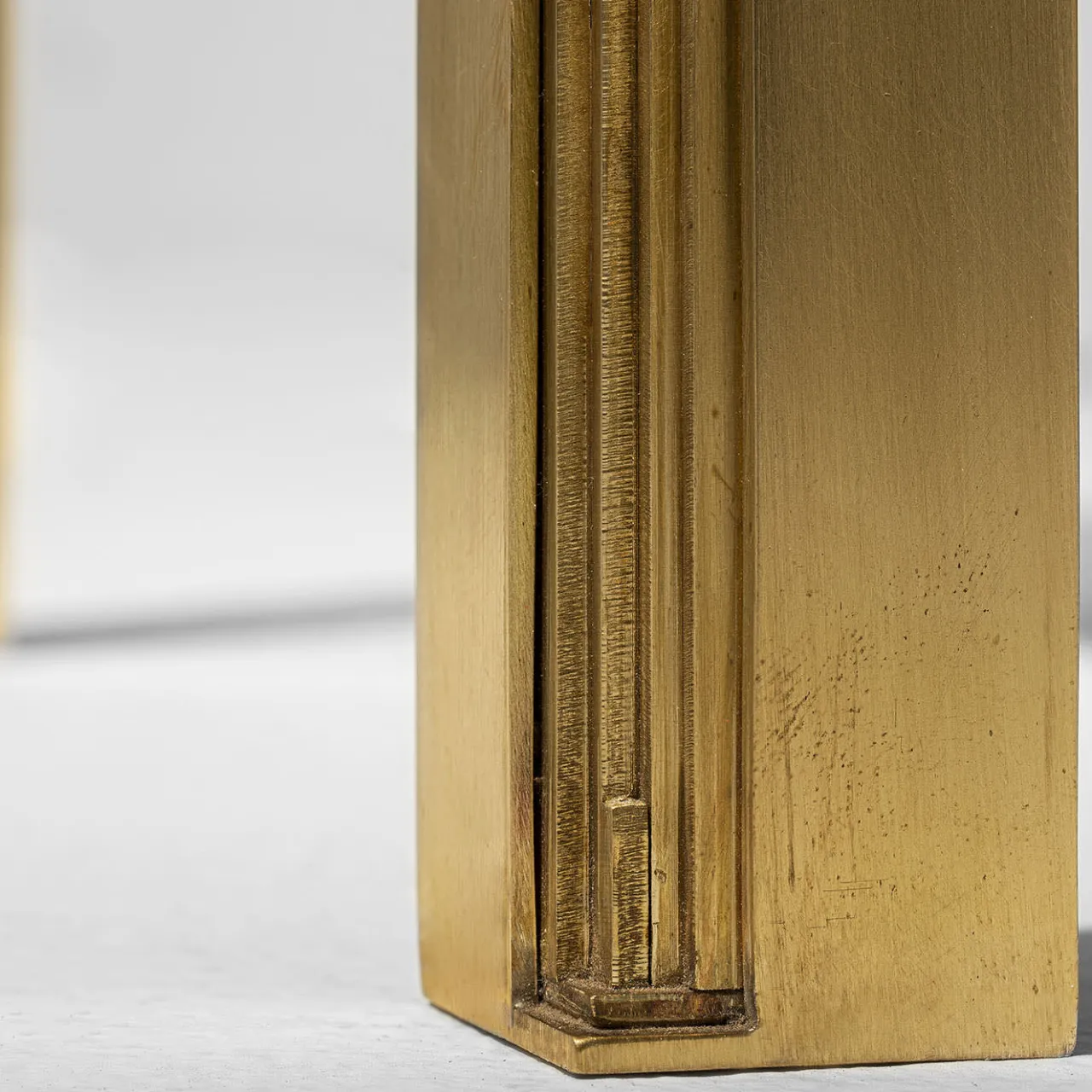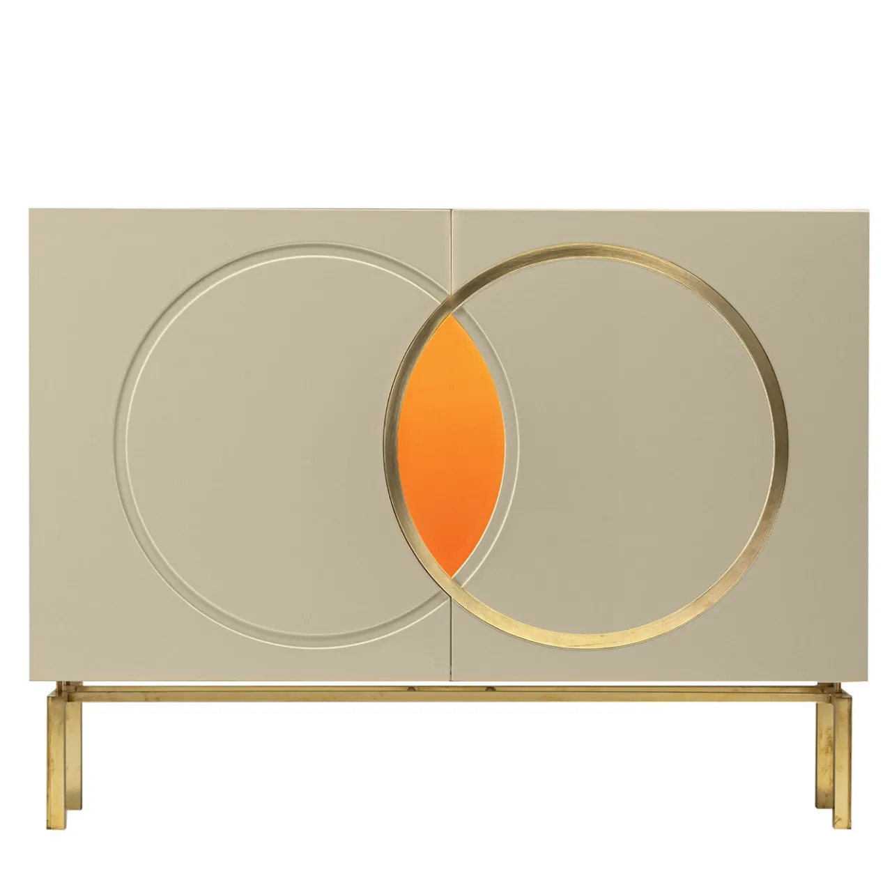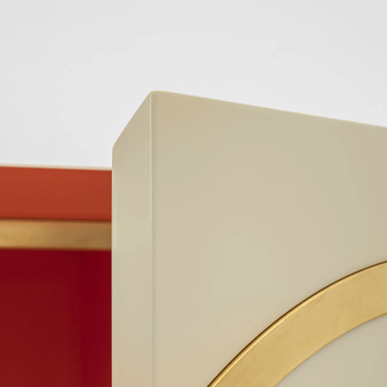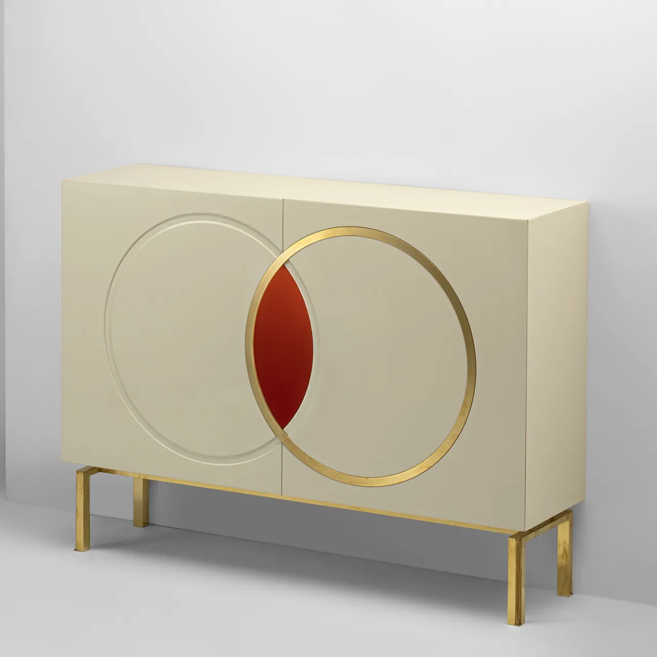 La credenza ha un motivo decorativo ad anello in ottone naturale. La struttura e i dettagli ricordano le opere dell’architetto Carlo Scarpa e i progetti degli anni Sessanta. La laccatura è frutto di un lavoro manuale. I bordi delle ante sono tagliati a 45° su tutti i lati, una particolarità che differenzia Brioni dalla maggior parte delle credenze industriali. Dieci elementi a incastro creano i piedi in ottone. L’interno è illuminato da due lampade LED ricaricabili senza fili con sensori di prossimità, arricchite da ripiani in vetro.