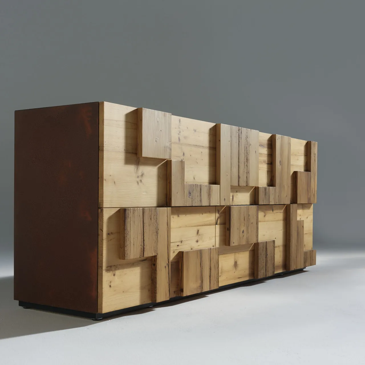 Valorizzate lo spazio con questa elegante credenza. Caratterizzata da una robusta struttura in MDF con elegante finitura Corten, vanta frontali in larice massiccio spazzolato. Include 2 ante laterali e 2 cassetti centrali estraibili. All’interno, i ripiani in vetro temperato offrono un’elegante sistemazione. Perfetto per qualsiasi casa moderna. Per ulteriori informazioni, rivolgersi al Concierge.