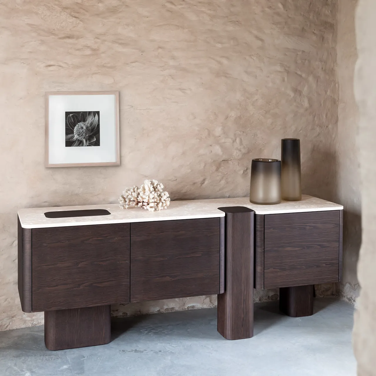 Realizzato in legno massiccio con piano in marmo, trae ispirazione dalle mura ciclopiche grazie al suo design geometrico a incastro. I materiali stratificati creano una silhouette dinamica, mentre le gambe monolitiche e le proporzioni generose conferiscono una presenza scultorea di grande impatto. La personalizzazione è disponibile, per maggiori informazioni contattare il concierge.