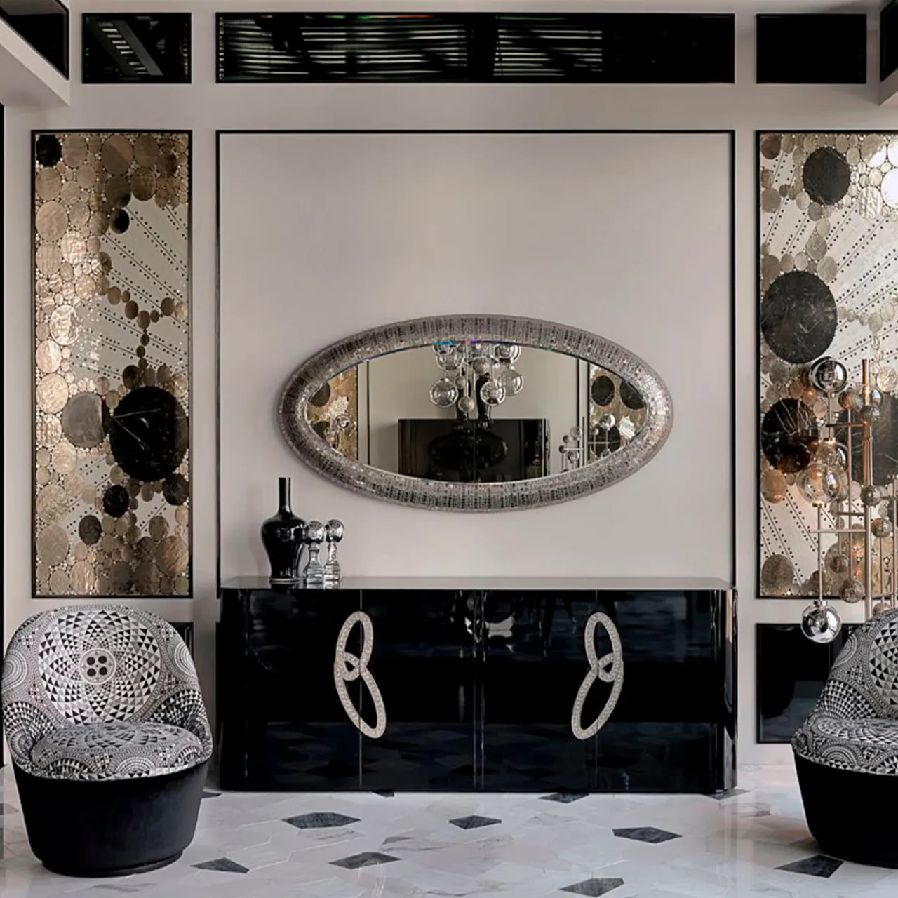 Grazie alla sua struttura in legno e al piano in marmo o in vetroresina, questa credenza ha un aspetto raffinato ed esclusivo. Le maniglie, in mosaico minuto, danno luce e tridimensionalità alle superfici del mobile.