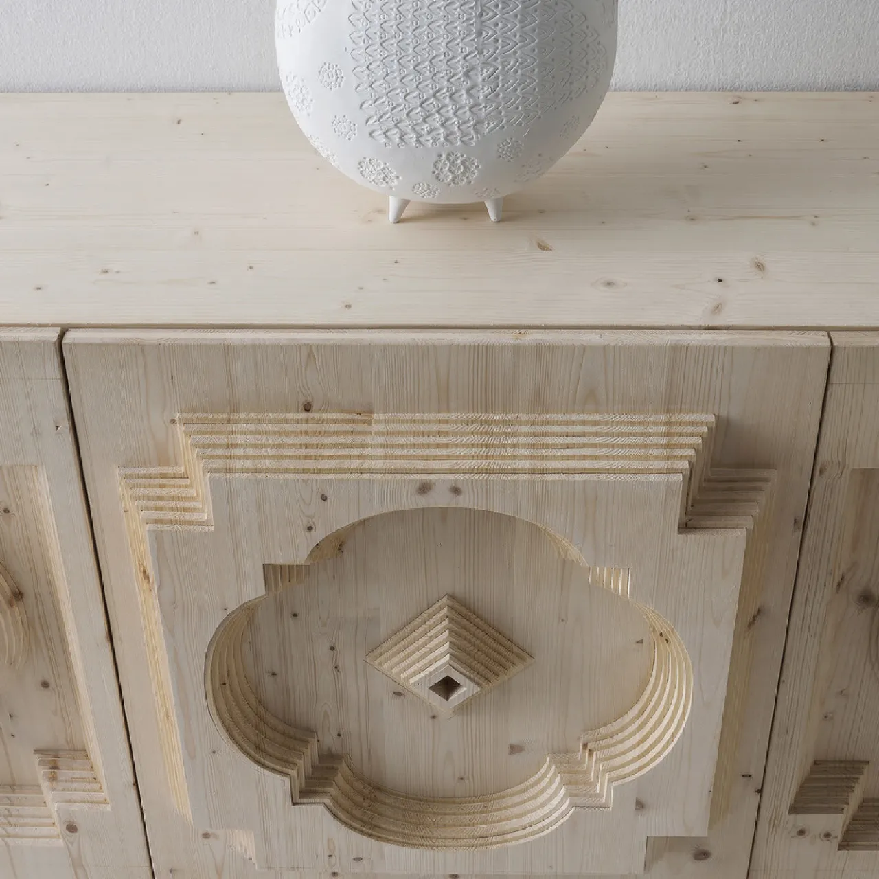 Questa credenza, che fa parte della Collezione Cortina, è un complemento decorativo di grande effetto per un arredamento moderno o rustico-chic. La sua struttura è realizzata interamente in legno, con venature uniche in tutto il suo insieme e in particolare nei tre pannelli frontali. Questi pezzi affascinanti sono intagliati con una tecnica innovativa per ottenere un effetto tridimensionale nella decorazione geometrica. È disponibile in altre misure e con diversi tipi di legno e finiture; chiedete al Concierge per i dettagli.
