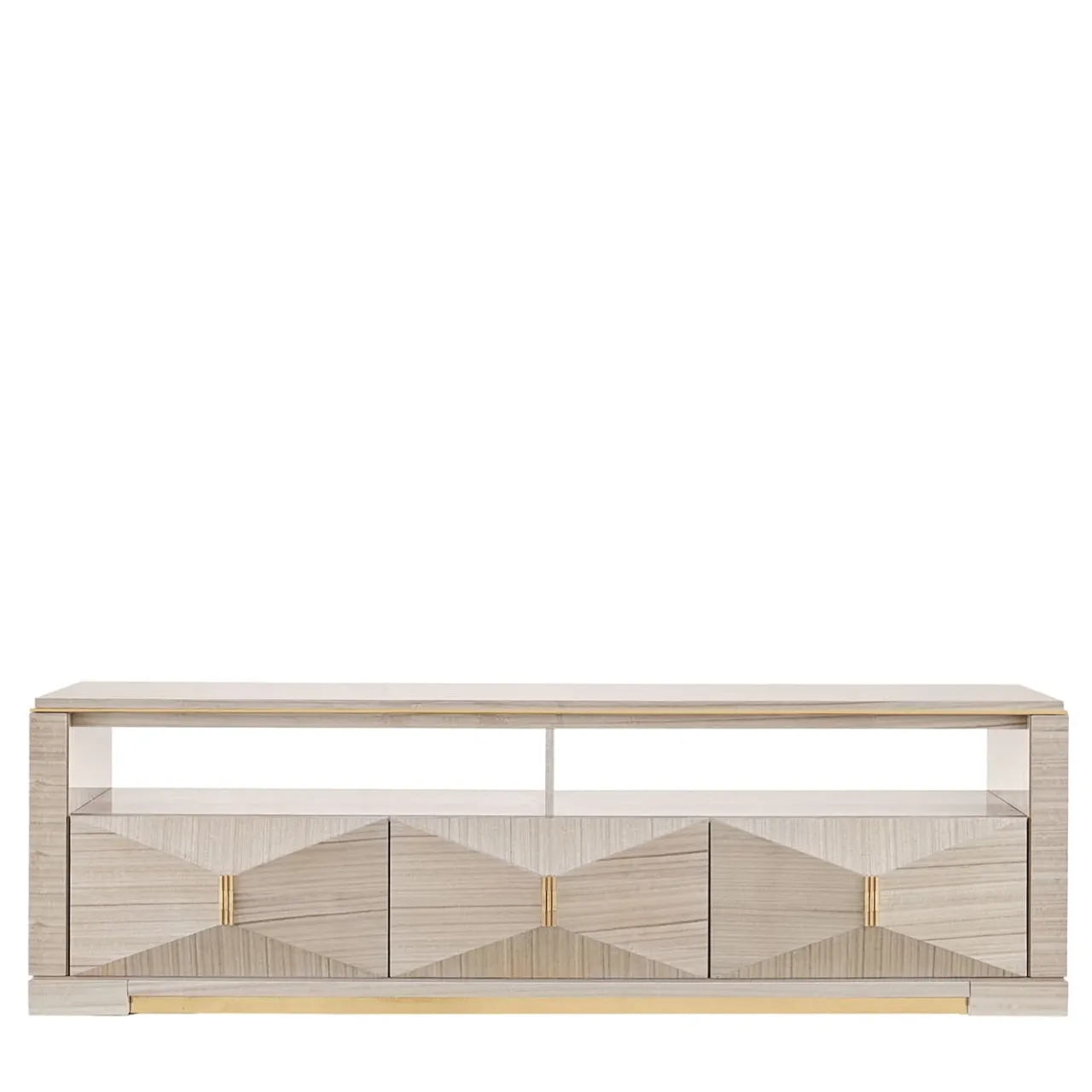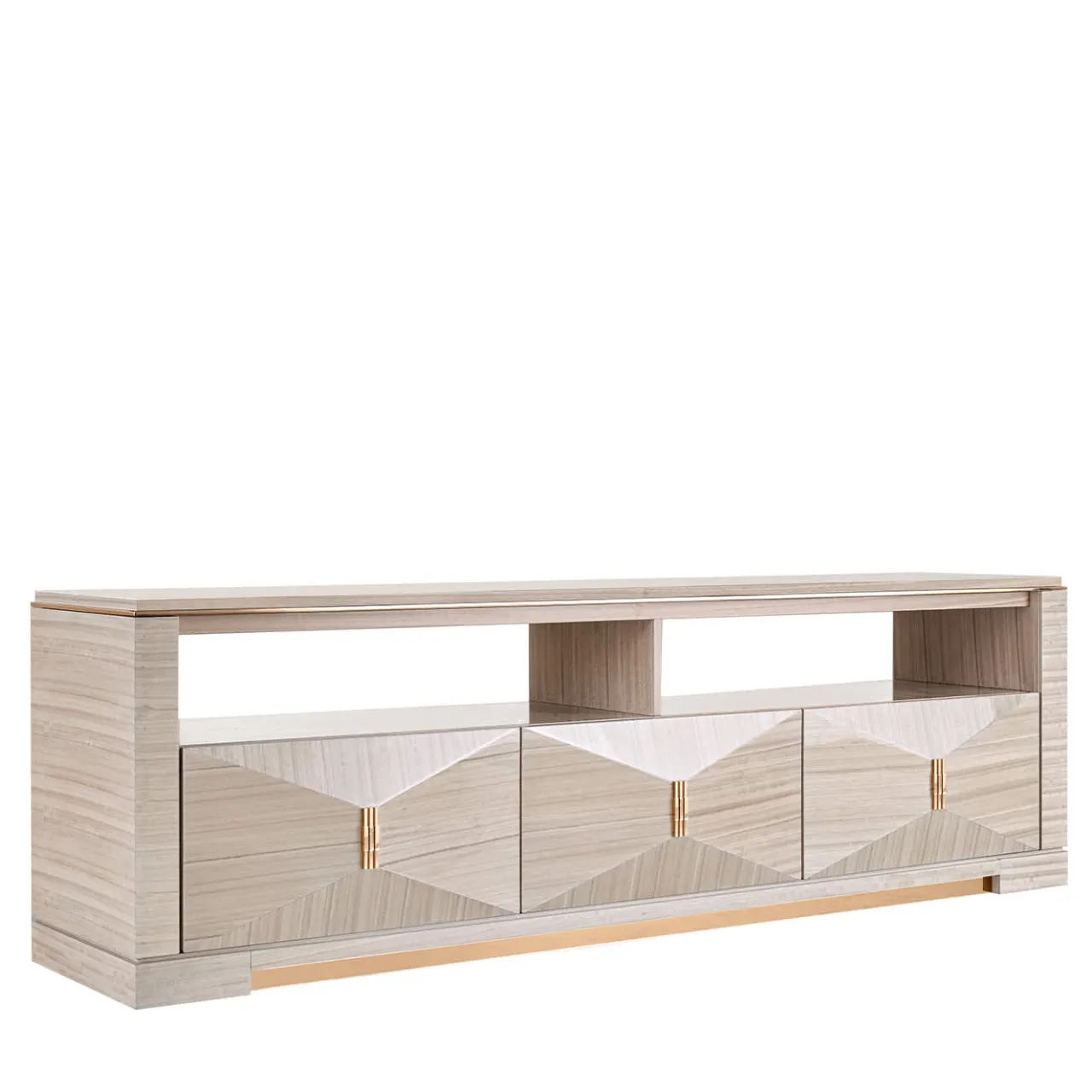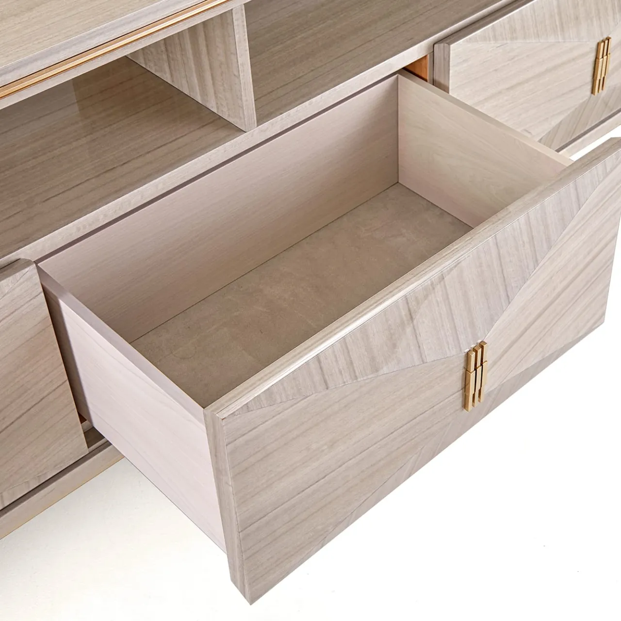 Questa credenza è realizzata in legno di Eucalipto con finitura lucida. Dotata di tre cassetti con frontali a piramide 3D e di un vano aperto, offre stile e funzionalità. Impreziosita da uno zoccolo decorativo e da raffinati accenti in metallo dorato, questo pezzo è una testimonianza di alta artigianalità.