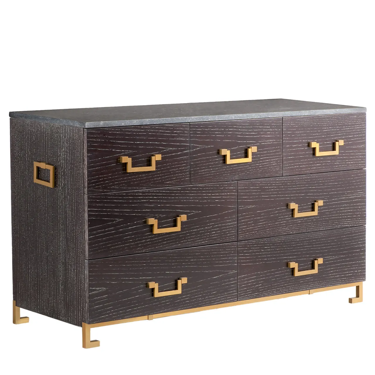 Composta da sette cassetti arricchiti da affascinanti maniglie in ottone elegantemente abbinate a due maniglie decorative laterali, questa raffinata credenza unisce estetica e funzionalità in un design pulito e raffinato firmato Michele Bonan. Realizzata a mano in rovere nero, è completata da un elegante piano in pietra di petit granite. Su richiesta, è disponibile anche nella tonalità naturale; per maggiori dettagli, contattare il Concierge.