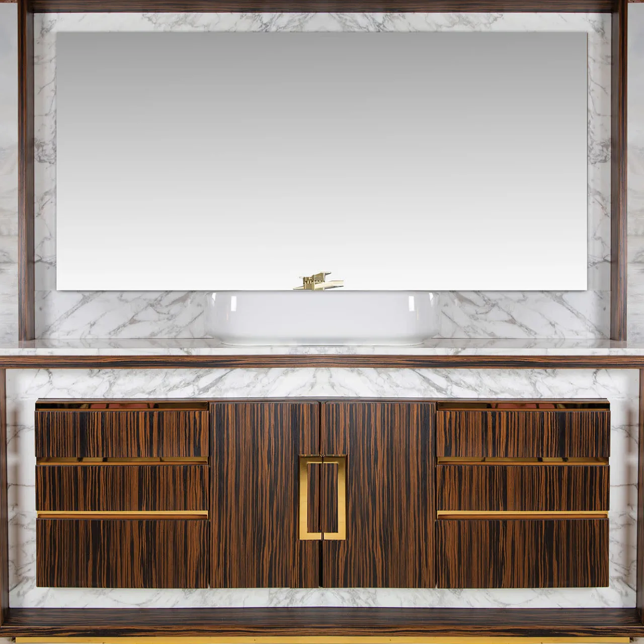 La credenza Frame in noce massello coniuga lo stile contemporaneo con l’artigianato Made in Italy. La cornice racchiude e protegge il marmo Arabescato in una preziosa teca di legno e metallo e lo fa risaltare con un sistema di illuminazione interna dedicato. La credenza è composta da due ante, con ripiani interni regolabili in altezza, e da sei cassetti, tre per lato. Sopra la credenza, uno specchio strutturato in legno con inserti in marmo Arabescato. Chiedere al concierge per le opzioni di personalizzazione.