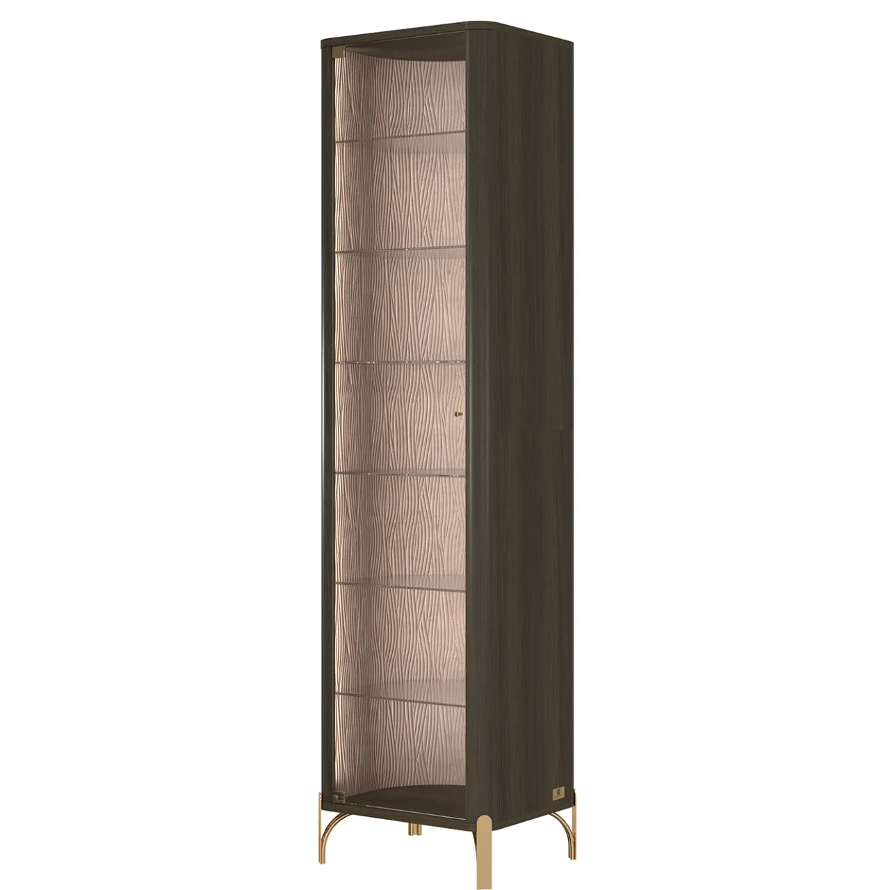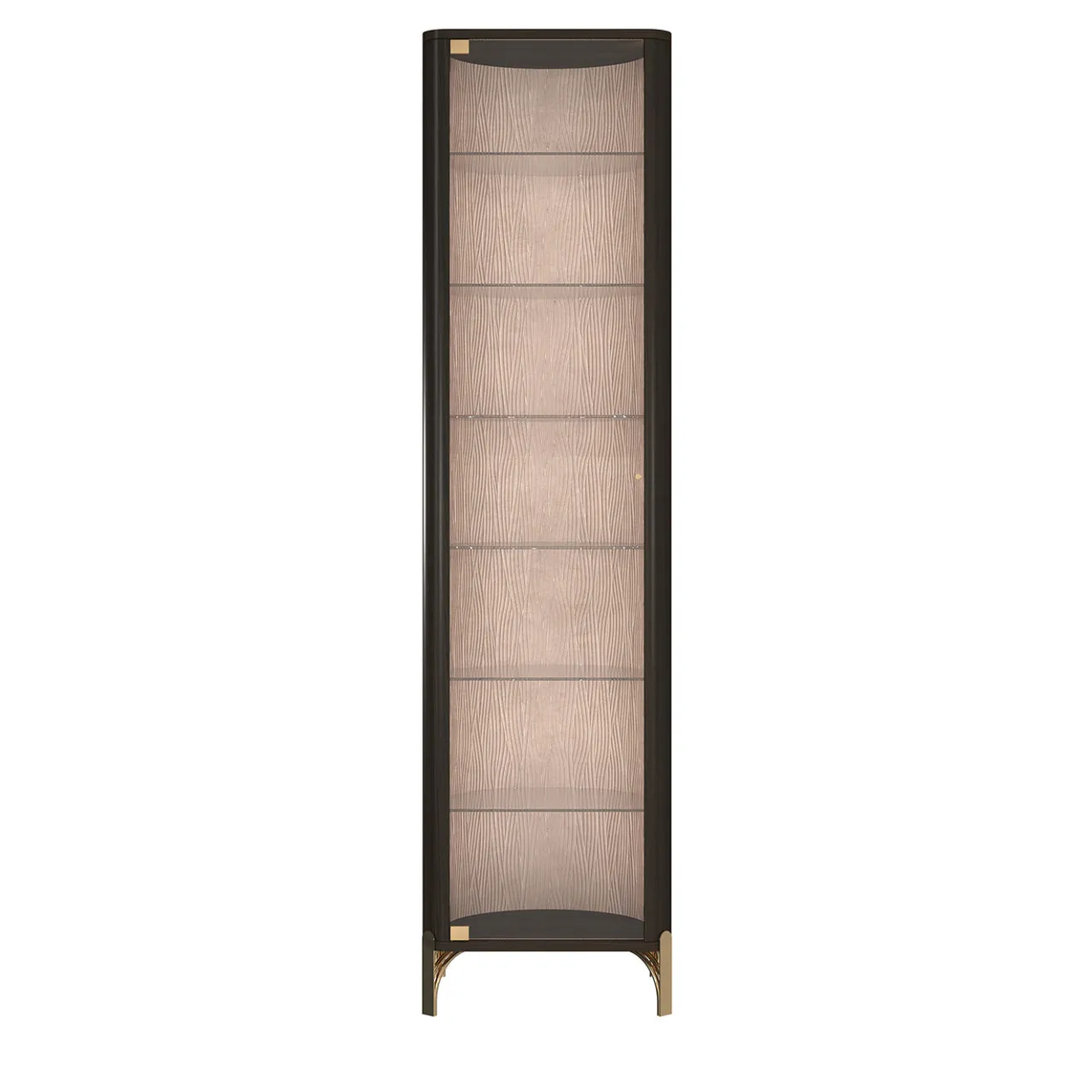 Credenza in vetro a porta singola con illuminazione LED integrata, dotato di sette ampie mensole in vetro che offrono spazio espositivo generoso e ordinato. Il design essenziale e pulito la rende adatta a diversi ambienti, dal soggiorno al corridoio fino alla zona notte. L’interno è rivestito in tessuto con motivo cream testurizzato, mentre i piedini in metallo aggiungono un tocco di eleganza contemporanea. La struttura unisce funzionalità e raffinatezza, rendendo questo mobile una soluzione ideale per valorizzare lo spazio con discreta eleganza.