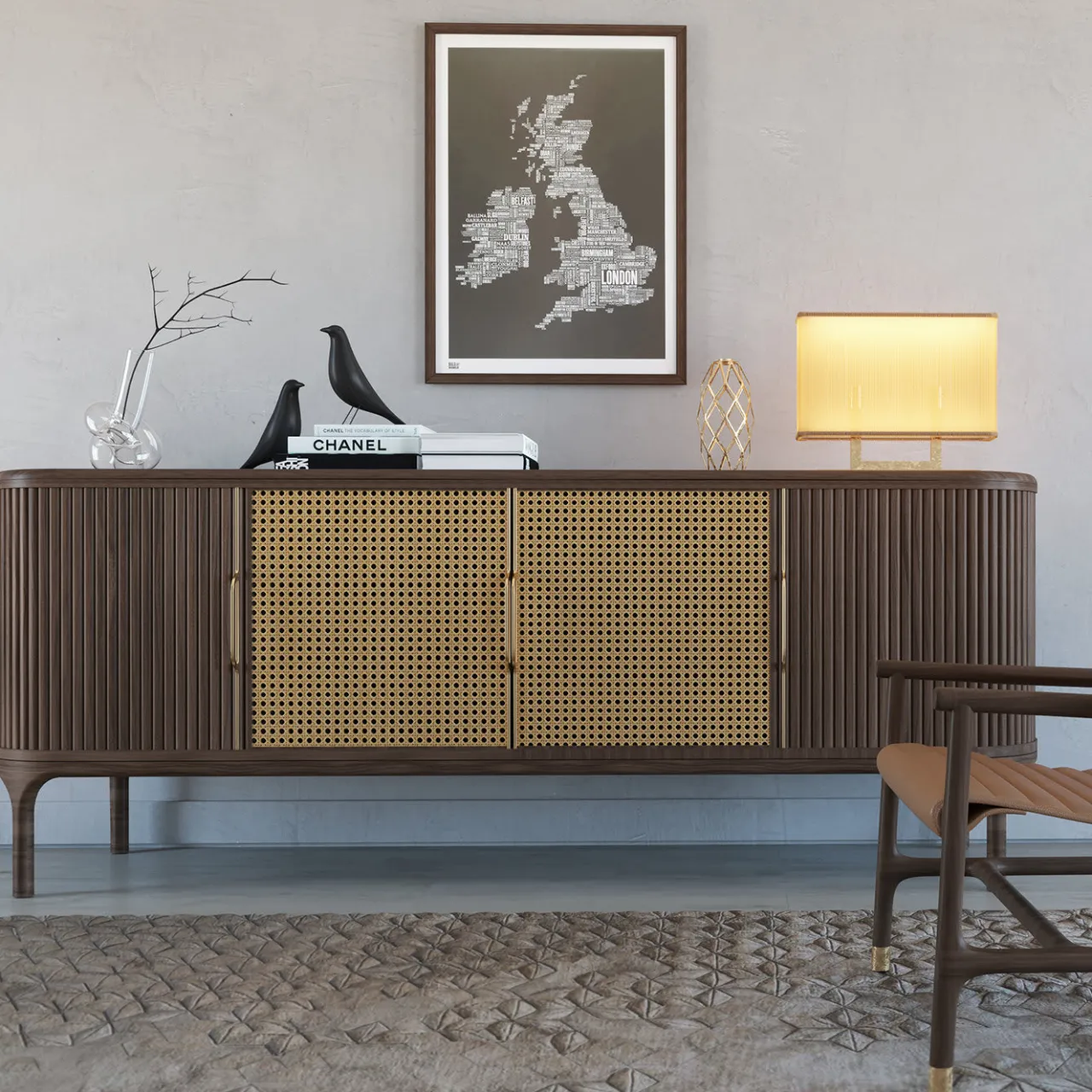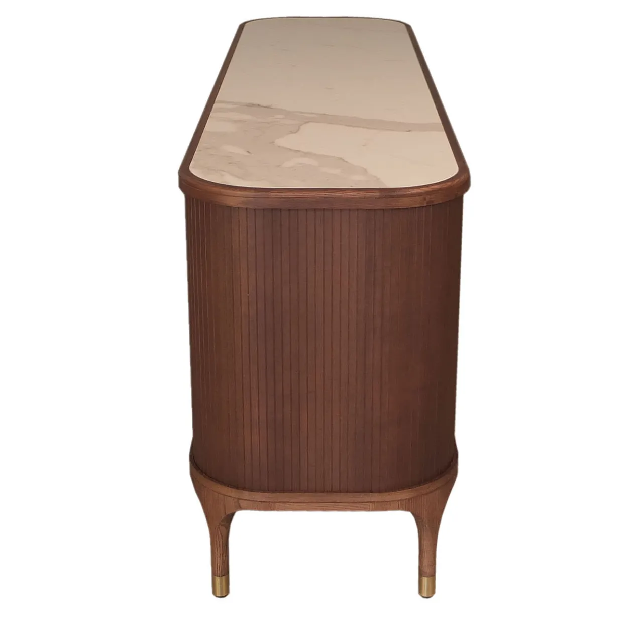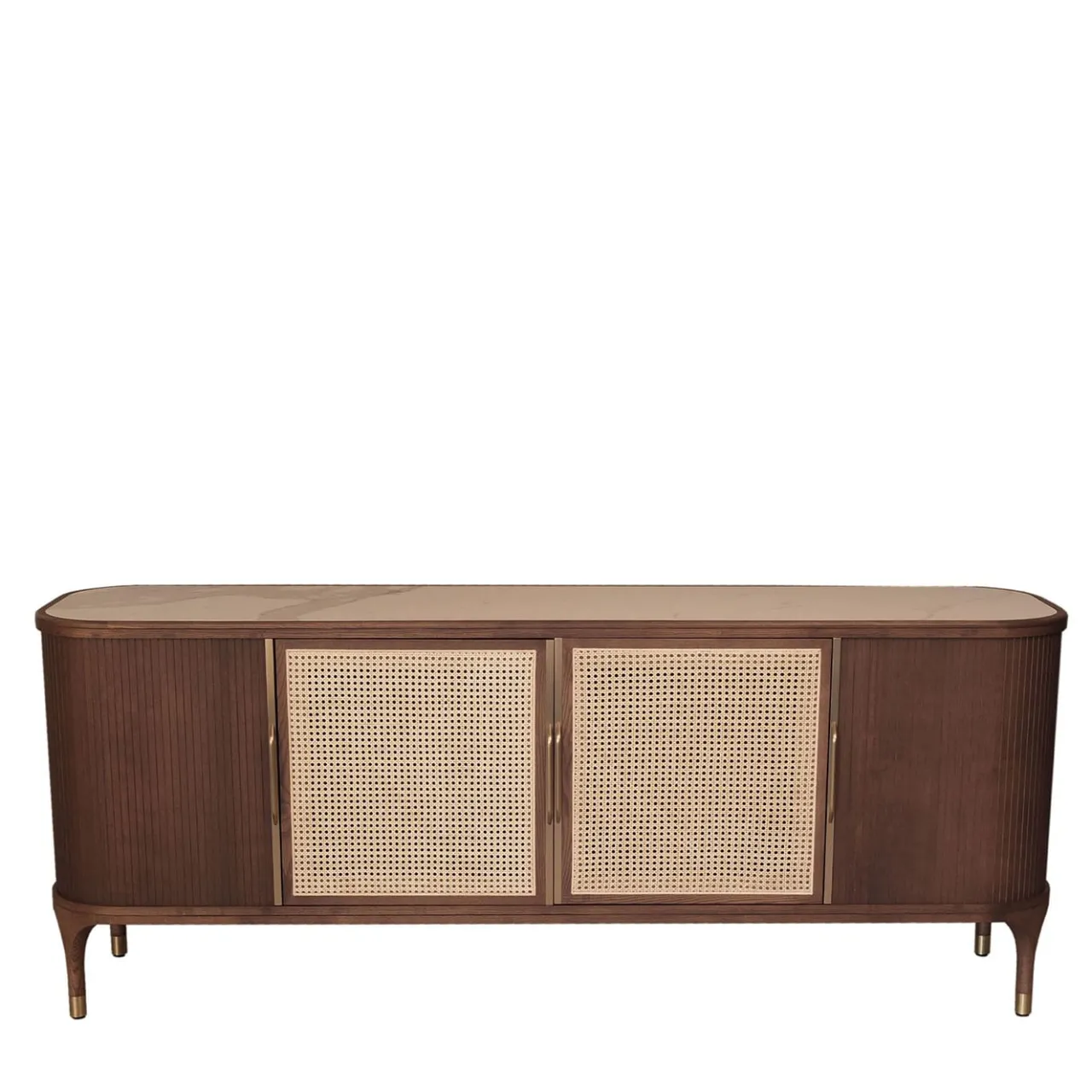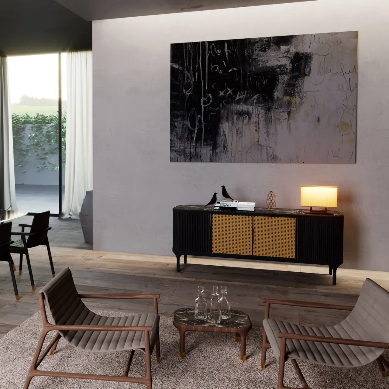Questa raffinata credenza in frassino presenta affascinanti fianchi arrotondati sostenuti da quattro piedi affusolati. La finitura wengé delle ante scorrevoli laterali ne mette in risalto la trama scanalata e si integra con la raffinata canna viennese che riveste le due ante centrali a battente. Quattro delicate maniglie in ottone aggiungono un accento luminoso a questo design, caratterizzato da un piano in ceramica Calacatta bianca, disponibile anche in ALTRI COLORI su richiesta. Disegnato da Libero Rutilo. Le sfumature di colore o le venature del marmo o della ceramica possono variare per ogni prodotto. Poiché ogni mobile è realizzato artigianalmente, la scelta dei materiali naturali viene fatta per ogni singolo mobile creato. Le foto presentate sul portale sono da considerarsi indicative, in quanto ogni pezzo è unico e irripetibile rispetto agli altri della stessa collezione, ciò ne contraddistingue l’originalità e l’artigianalità.