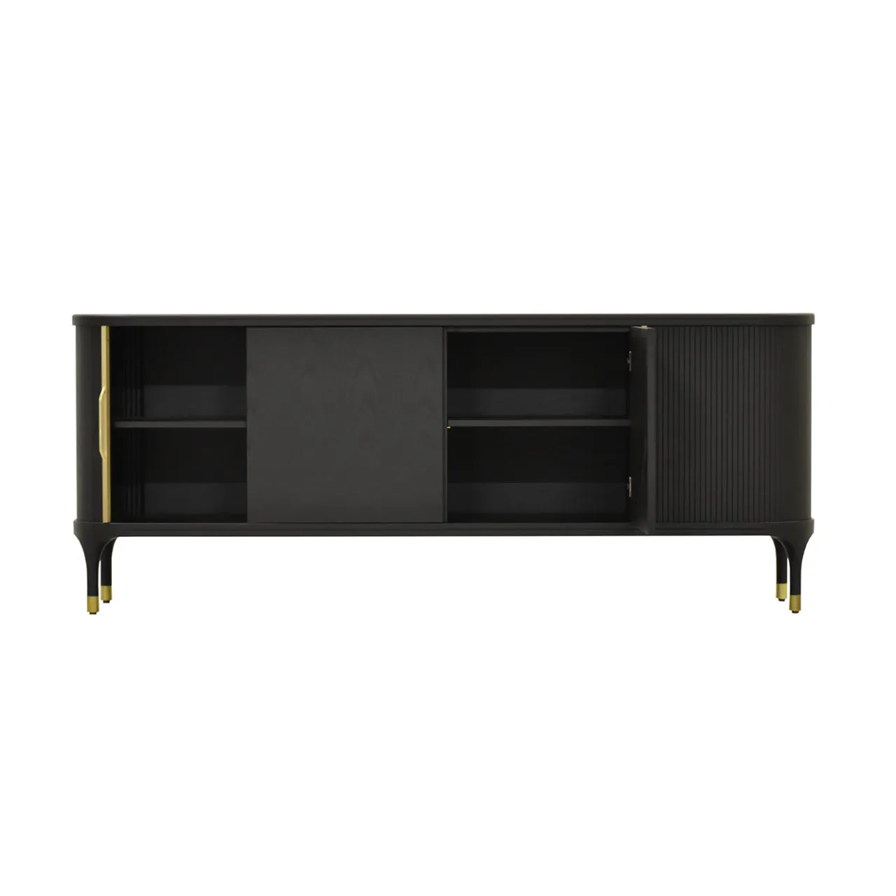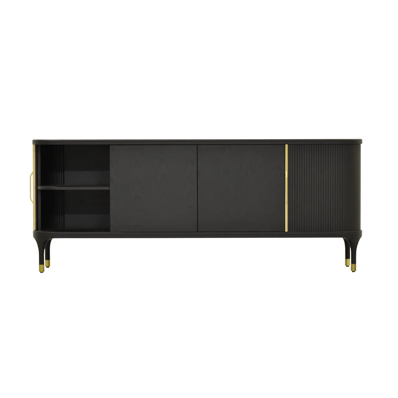 Poggiata su quattro piedi affusolati impreziositi da dettagli in ottone, questa credenza è un pezzo sofisticato adatto a un’ampia varietà di decori. La struttura in frassino massiccio presenta un’elegante finitura nera, che si sposa con la texture scanalata delle due ante scorrevoli laterali. Le ante centrali a battente mostrano le caratteristiche venature del frassino e presentano due sottili maniglie in ottone sui lati. Un ampio tavolo in legno, disponibile su richiesta con piano in vetro, completa questo pezzo esclusivo. Progettato da Libero Rutilo.