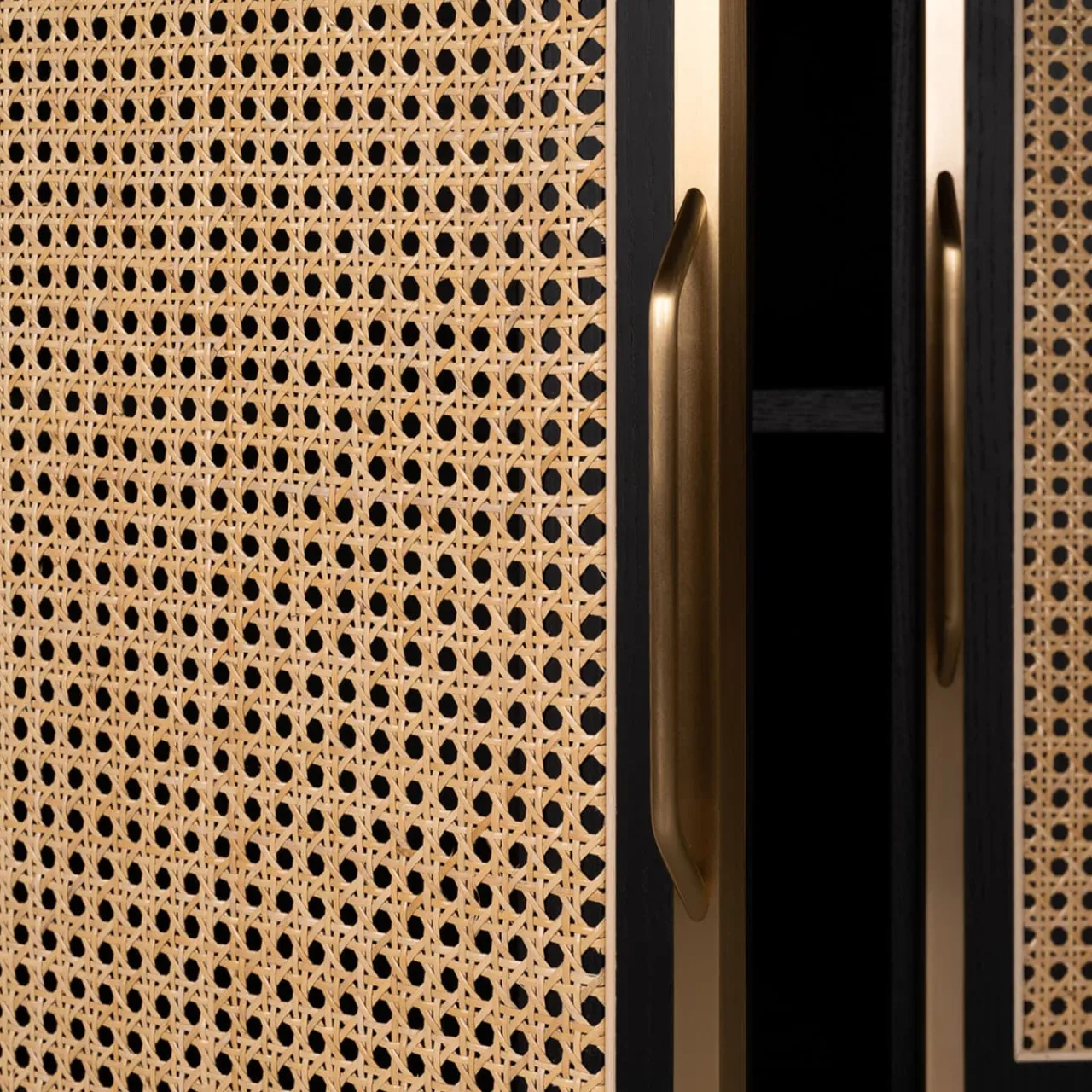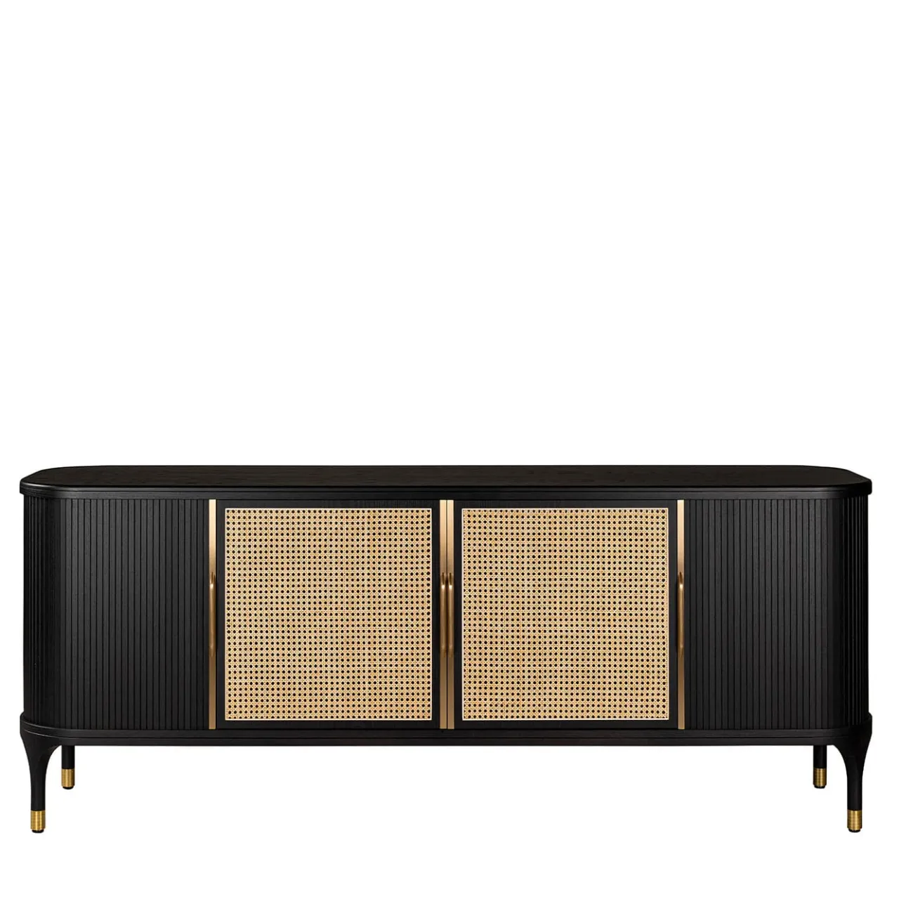 Questa credenza glamour presenta una combinazione classica di materiali in una reinterpretazione moderna e accattivante. La sua sofisticata struttura in frassino è arrotondata ai bordi e presenta un’intramontabile finitura nera, che si adatta alla canna viennese bianca delle ante centrali a battente. Le ante laterali scorrevoli presentano una texture scanalata, mentre i piedi affusolati della credenza sono impreziositi da dettagli in ottone, che costituiscono anche le maniglie. Il piano è in legno, si prega di chiedere al Concierge per dettagli e prezzi. Disegnata da Libero Rutilo.
