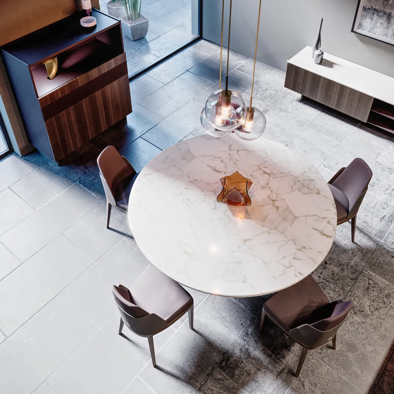 Questa credenza di grande modernità è caratterizzata da una silhouette rigorosa e slanciata, realizzata in legno e impiallacciata con pregiato legno di rovere grigio dalle venature naturali. I piedini traforati in metallo satinato titanio sono attraversati perpendicolarmente da piccoli pannelli rivestiti in ecopelle che aggiungono un prezioso accento di lusso al pezzo, impreziosito dal luminoso piano in marmo bianco. Dotata di due cassetti push-pull, la struttura presenta un’anta laccata e fresata e un vano a giorno diviso da un ripiano centrale.