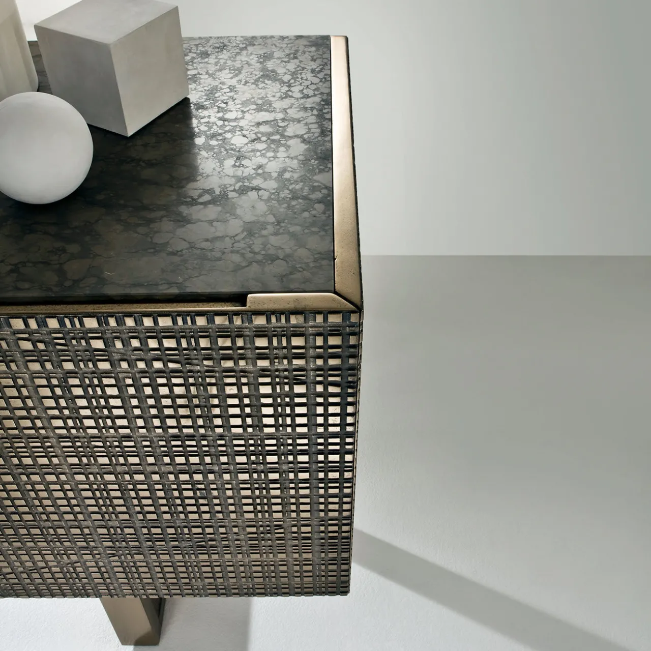 Questa superba credenza fa parte della Collezione Maxima, che si distingue per la sua rigorosa silhouette geometrica e per gli splendidi pannelli frontali e laterali. Il piano in marmo Gris Vignè è completato dalla restante struttura in noce Canaletto, dotata internamente di due cassetti completamente estraibili. I pannelli vantano l’innovativa finitura Liquid Metal, ottenuta miscelando polvere di metallo e applicandola sulla superficie in legno, per un contrasto materico dinamico. Questo pezzo sarà un prezioso oggetto di arredamento funzionale, grazie alla sua pregiata lavorazione artigianale e all’armoniosa combinazione di innovazione e tradizione.