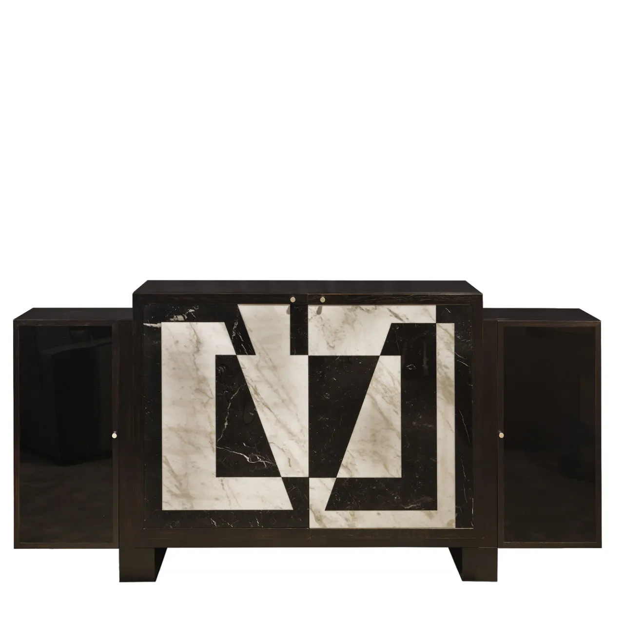 Un pezzo straordinario di arredamento funzionale, questa credenza si ispira al design audace dei mobili art déco e presenta una struttura artigianale in rovere con gambe corte. Interamente dipinto a mano con finitura nera, il mobile presenta due ante: i due pannelli laterali sono rivestiti in vetro e affiancano le due grandi ante centrali, il cui frontale è impreziosito da intarsi in marmo nero Marquina e oro Calacatta, che creano una magnifica decorazione geometrica con una combinazione di colori bianco e nero. All’interno, il mobile è rifinito in un suggestivo rosso con ante a specchio.