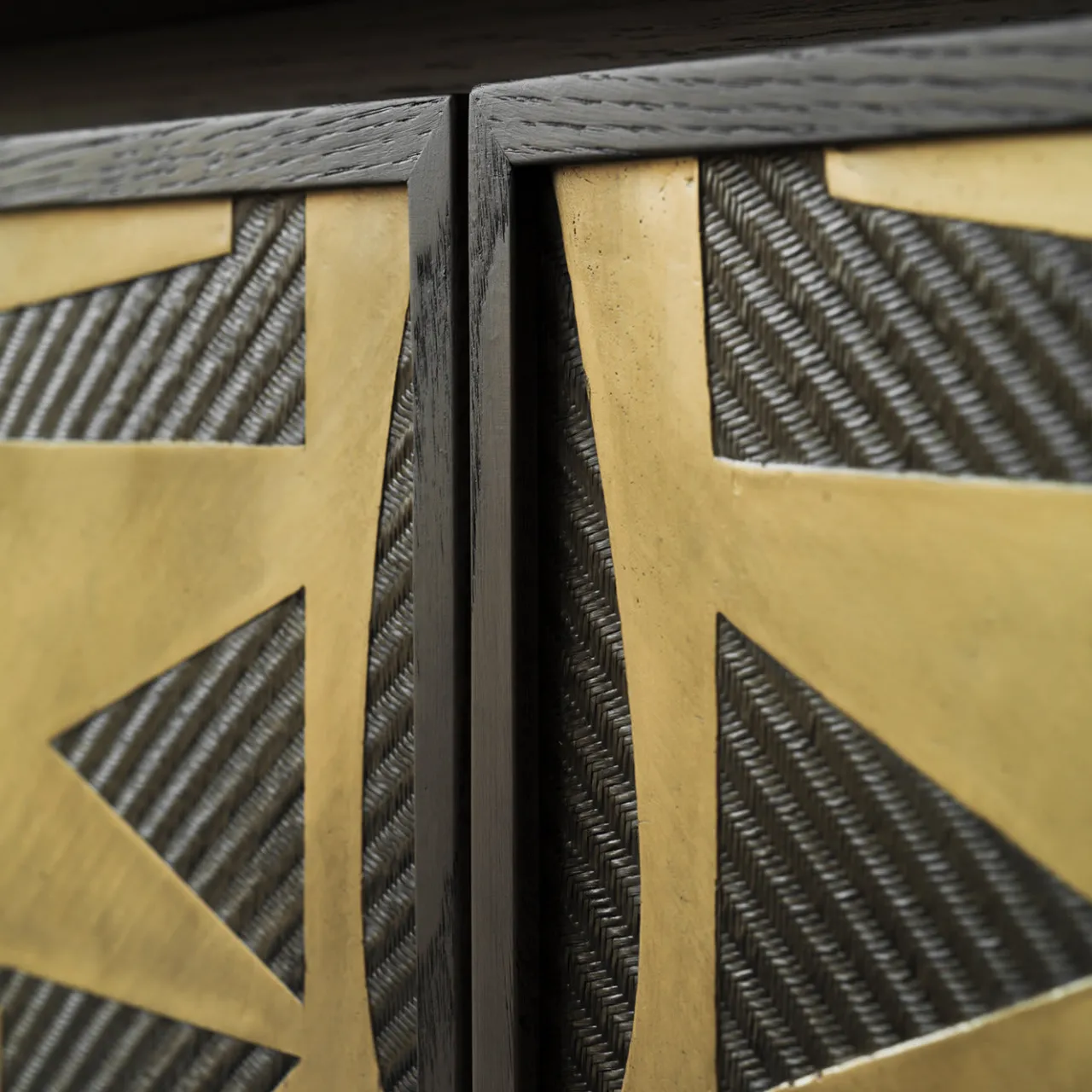 Pezzo forte della collezione Couture di Chiara Provasi, la credenza Mila Abstract Painting è il frutto di una ricerca sull’intersezione tra moda, arte e arredamento. Realizzata a mano in rovere con finitura grigia, la credenza presenta due facce del mobile in gesso dorato in un disegno astratto simmetrico e poggia su sei eleganti piedini in bronzo.