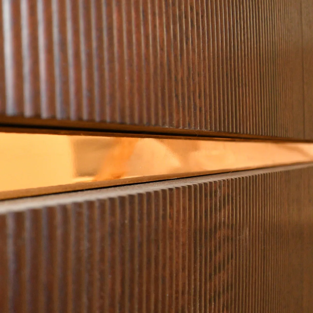 L’impeccabile maestria artigianale incontra l’eleganza di metà secolo in questa raffinata credenza che combina una scintillante struttura in metallo placcato oro con cassetti in massello di noce italiano. Il mobile, che poggia su gambe affusolate con piedini luminosi e base a croce in ottone placcato oro, vanta una struttura armoniosa i cui profili arrotondati sono diligentemente abbracciati dai cassetti in noce ornati da una fitta trama a coste. Il piano in marmo bianco di Carrara aggiunge ulteriore lusso all’insieme.