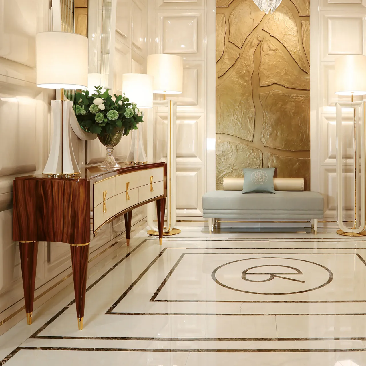 La credenza Montenapoleone è realizzata in legno massiccio con finitura lucida Palissandro Santos. Accentuata da dettagli in metallo dorato per un tocco raffinato, la sua struttura elegantemente curvata è dotata di sei cassetti rivestiti in nabuk. Dotata di meccanismi di chiusura ammortizzata, questa consolle è un’aggiunta elegante e funzionale alla casa.