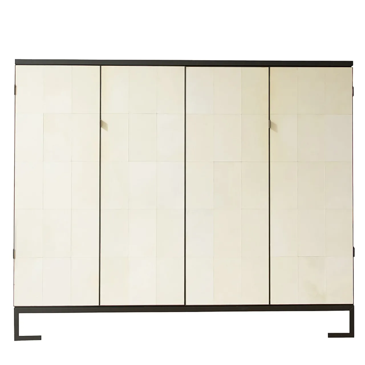 Questo mobile presenta una struttura in rovere scuro e ante rivestite in pelle. La caratteristica principale è l’apertura completa delle quattro ante, che si ripiegano sui lati del mobile, lasciando aperto l’intero spazio frontale. Su richiesta, i rivestimenti delle ante sono personalizzabili.