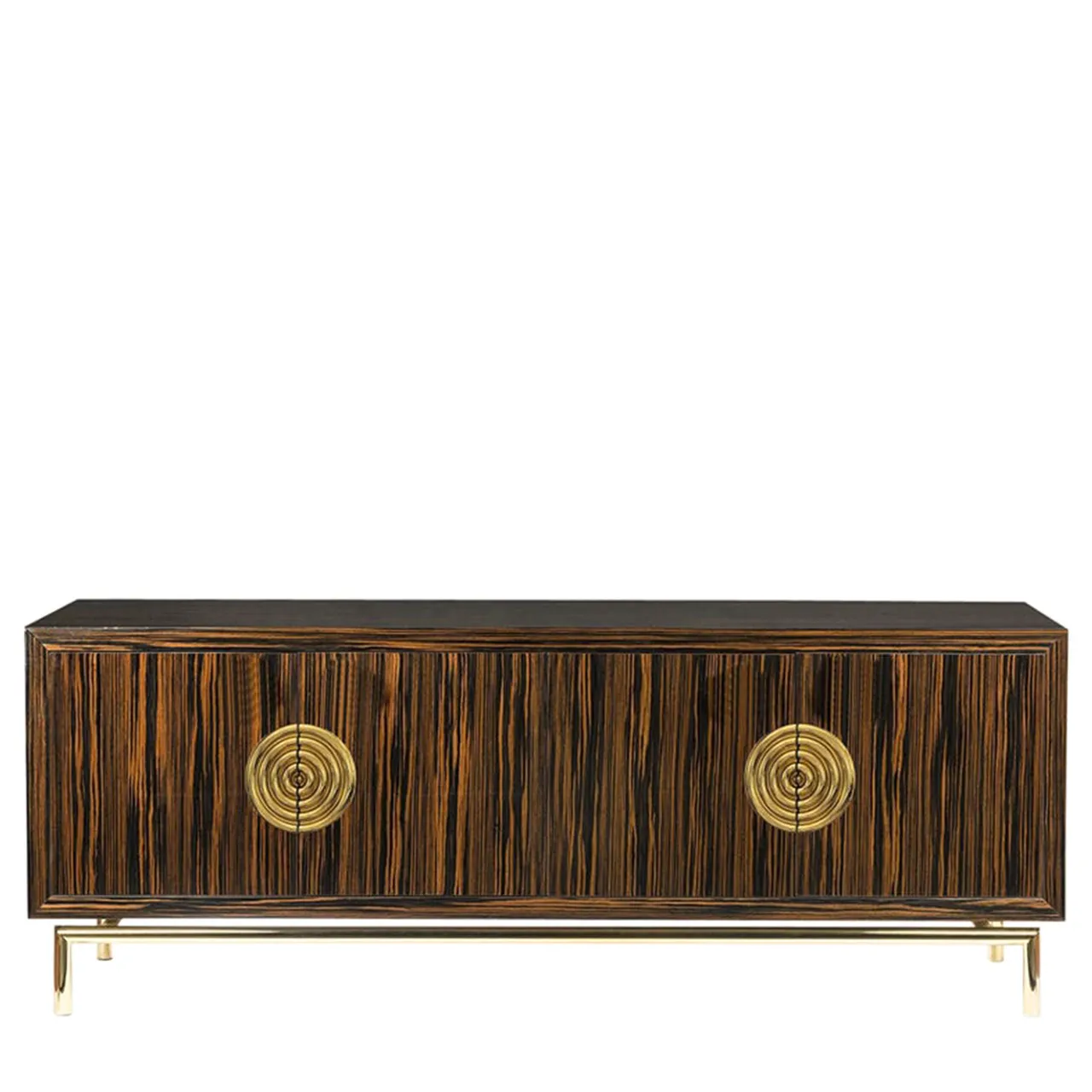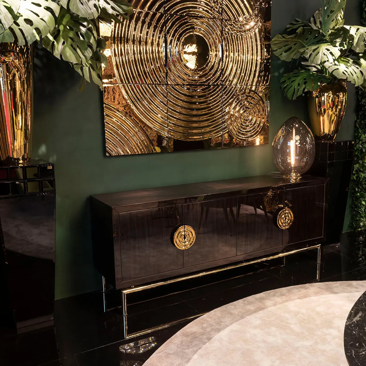 Soluzione chic per riporre oggetti in sale da pranzo e soggiorni, la credenza New Secret ha un’estetica raffinata e aggraziata, caratterizzata da una moderna base in tubolare metallico con finitura lucida oro 24k. Realizzata in ebano tamburato con finitura spazzolata 100 Gloss, presenta una cornice lucida da 20″ che racchiude le 4 ante dotate del sistema di chiusura ammortizzata Salice e impreziosite dalle esclusive maniglie in vetro dorato VG. L’interno laccato opaco è caratterizzato da uno schienale a specchio e da ripiani (uno in legno e due in vetro).