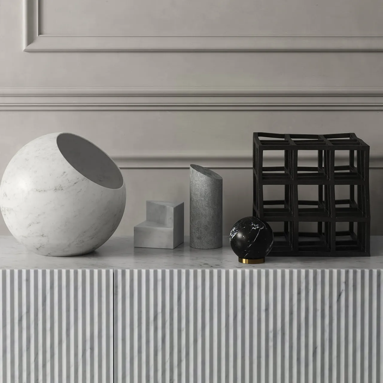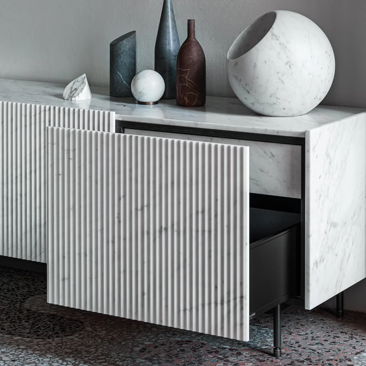 La credenza indipendente Pliss è una rivisitazione innovativa ed elegante di un mobile tradizionalmente funzionale. Con cassetti profondi incastonati in un involucro di pietra naturale, la credenza poggia su sottili gambe di metallo che contrastano con le ante del mobile che rubano la scena. Il mobile prende il nome dalla sua finitura plissettata. Disponibile in tre dimensioni e quattro pietre diverse: Bianco Carrara, Crema d’Orcia, Pietra d’Avola e Silk Georgette®.