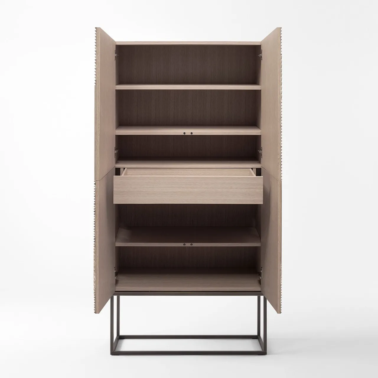 La versione alta Stripes a 4 ante è dotata di un meccanismo di apertura a pressione e di una base in ottone con finitura bronzo. Include ripiani e un cassetto nella stessa impiallacciatura della struttura, offrendo opzioni versatili di archiviazione: secretaire, mobile da cocktail o contenitore per la zona giorno. Il motivo distintivo è stato creato con profili triangolari in legno massiccio applicati a mano, producendo un effetto unico di variazione dei colori naturali del legno.
