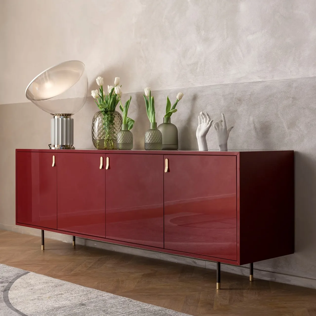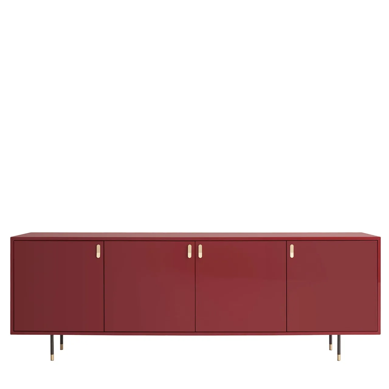 Rigorosa nelle sue linee minimaliste e seducente nella sua laccatura rosso marsala, questa credenza è un complemento di stile per arredamenti moderni e contemporanei raffinati. La finitura lucida ne sottolinea l’allure glamour, ulteriormente valorizzata dalla presenza di maniglie sagomate in ottone. Dotata di quattro ante in MDF per soddisfare le diverse esigenze di contenimento, presenta una scocca in metallo brunito con dettagli in ottone.
