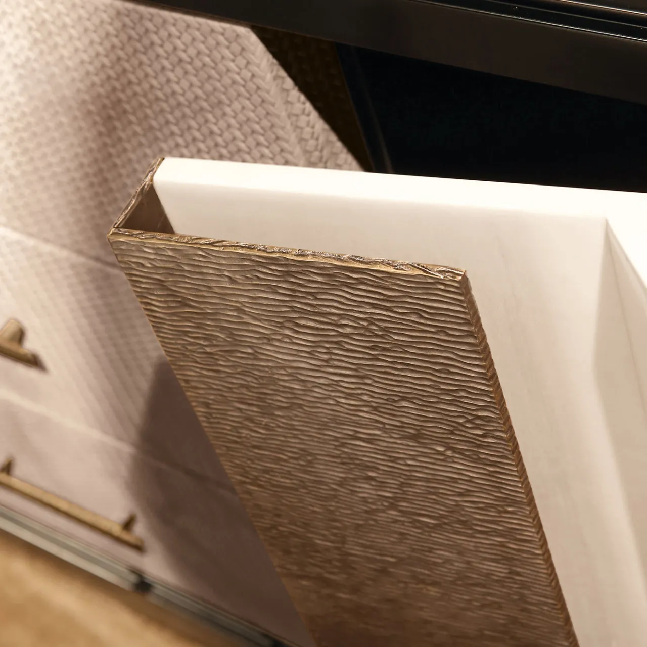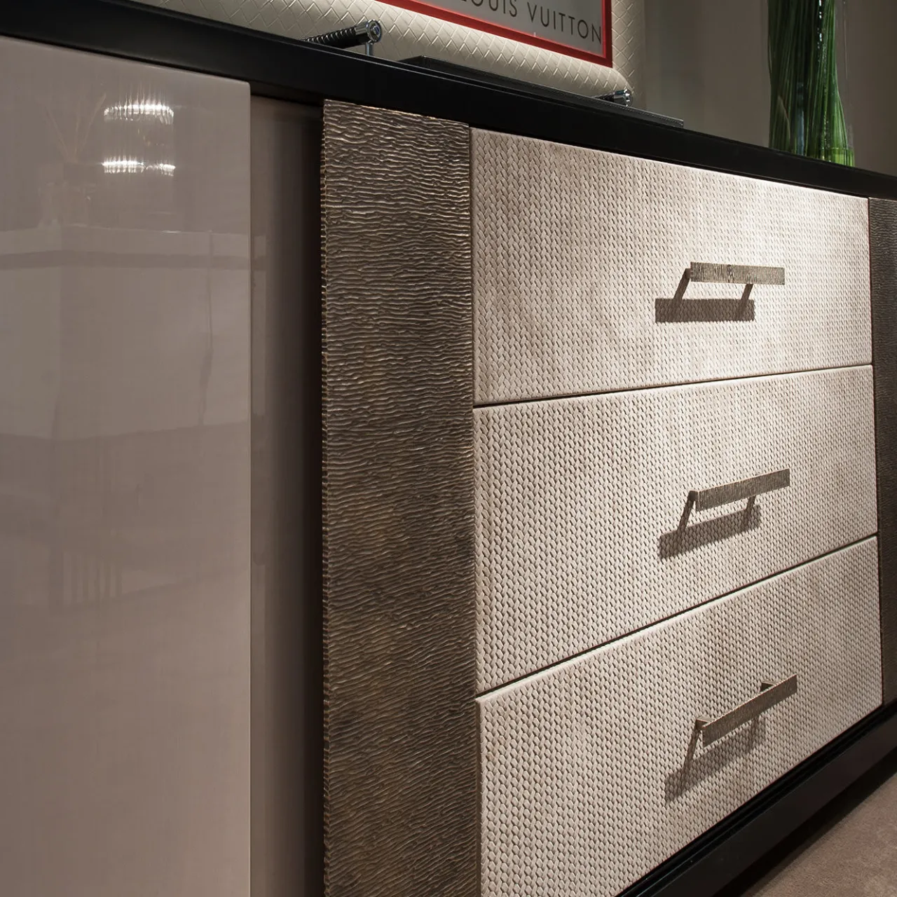 La credenza Zenith offre un ampio spazio di archiviazione in un design classico arricchito da materiali pregiati. Caratterizzata da due ante laterali e tre cassetti centrali, la struttura è realizzata in legno Anigre con finitura lucida, mentre i pannelli frontali dei cassetti sono rivestiti in pelle nabuk color tortora con dettagli cuciti a mano. Le maniglie lineari in bronzo sono realizzate esclusivamente a mano e i due pannelli verticali che separano i tre contenitori sono in ottone fuso.