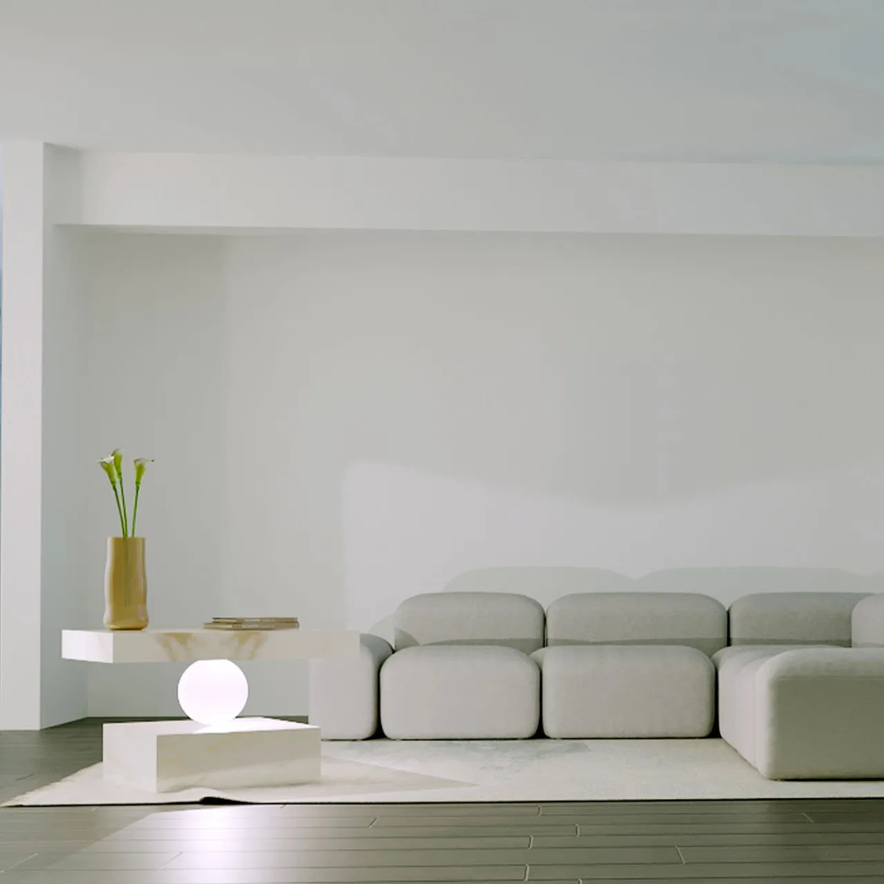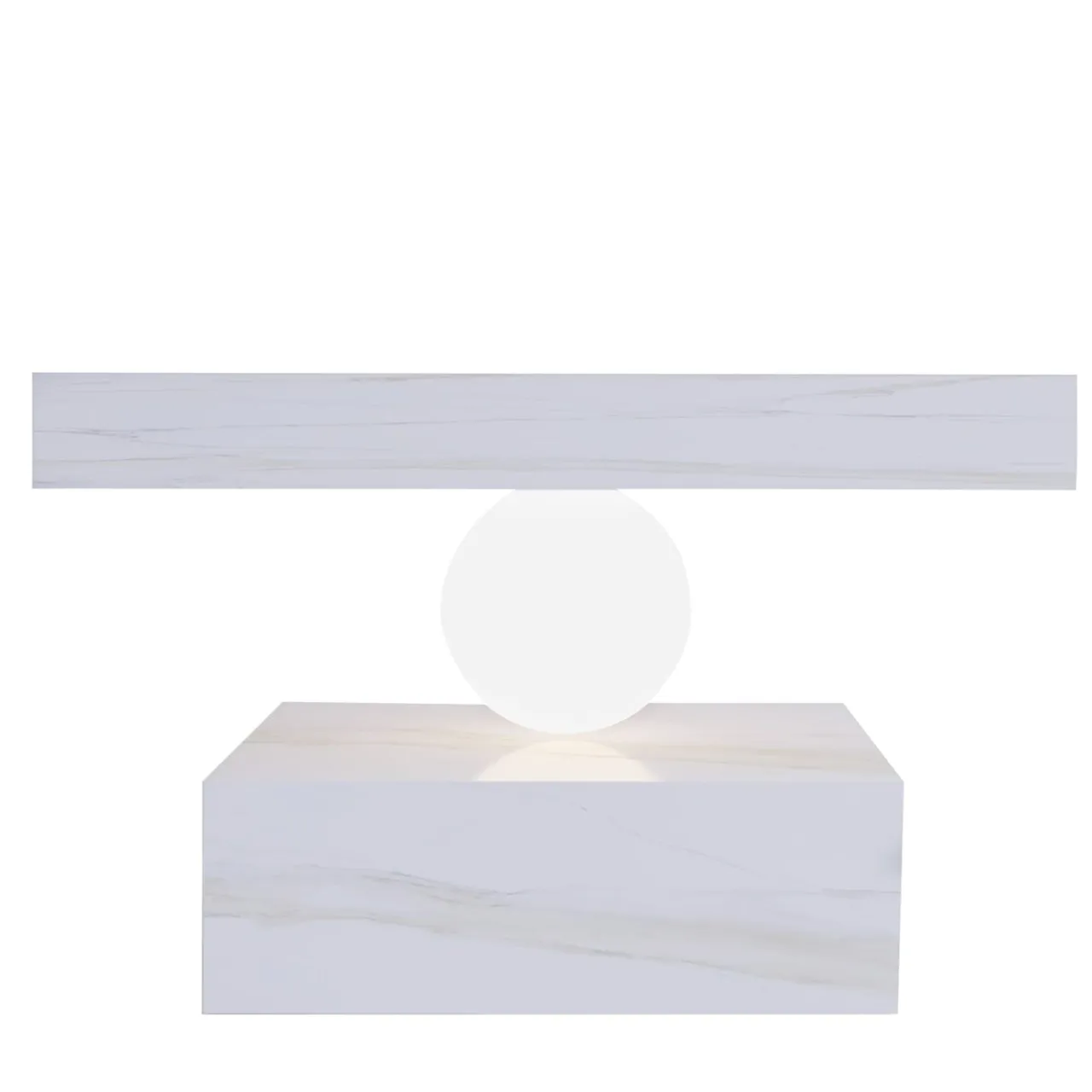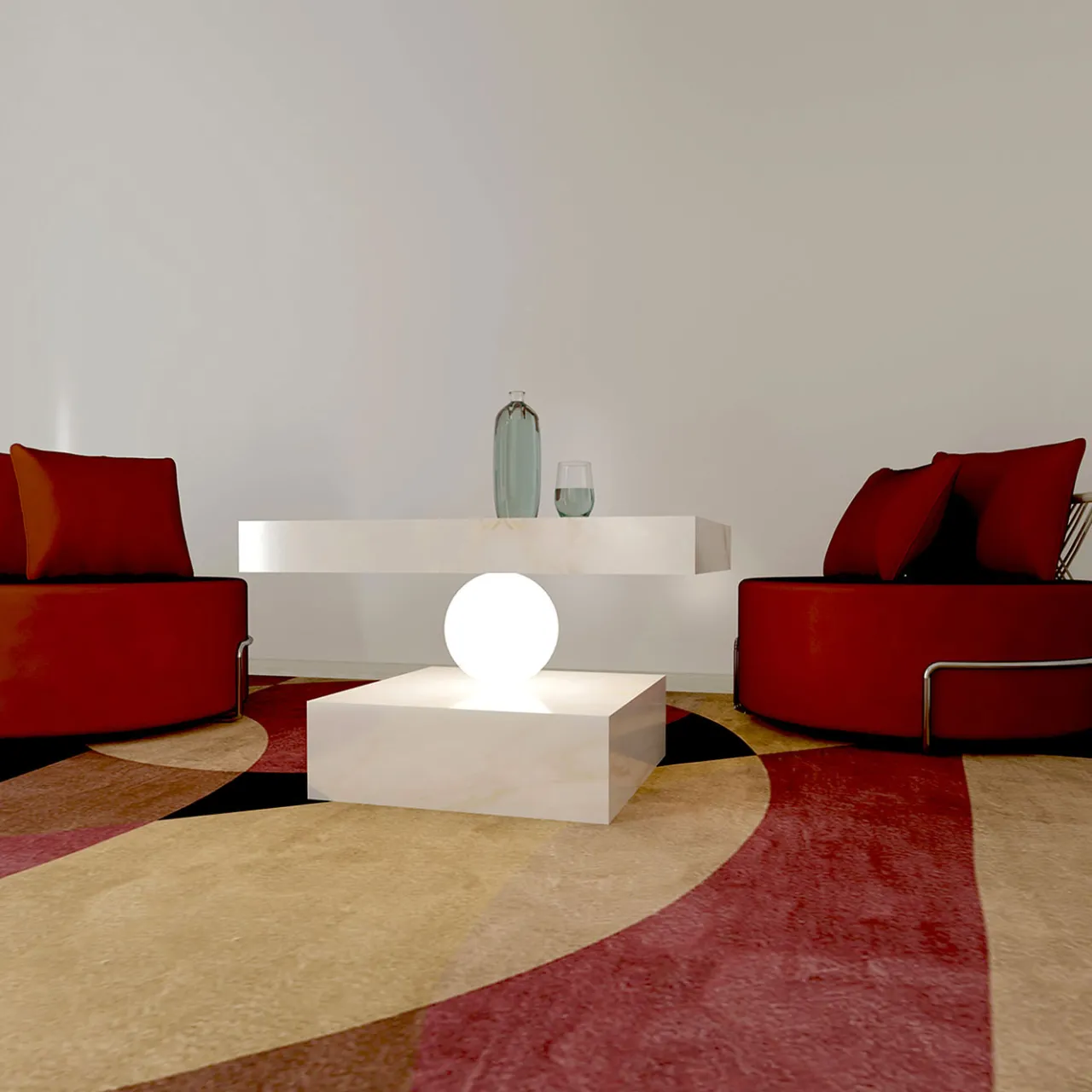 Due lastre di marmo delicatamente in equilibrio su una sfera che emana luce ed evoca un accattivante senso di tensione dinamica, che sembra sfidare le leggi stesse della fisica.