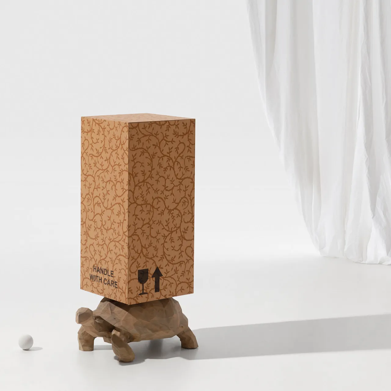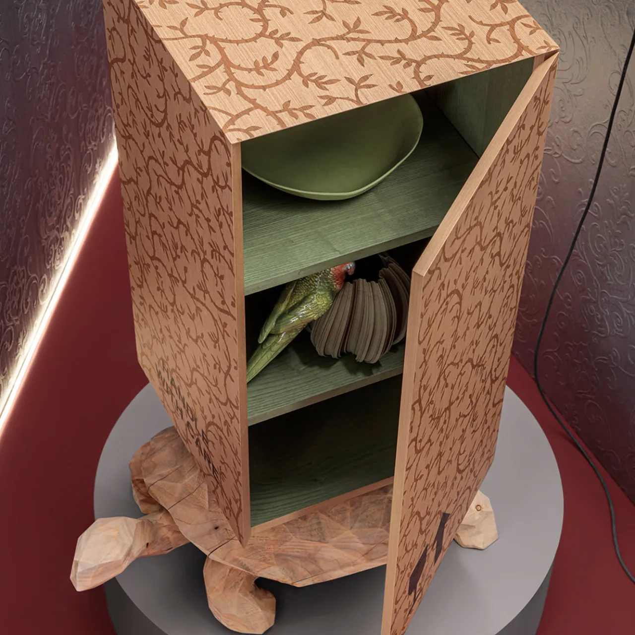 Parte della collezione Wooderkammer, prodotta in edizione limitata di soli otto esemplari, questa scultura-armadio non convenzionale è un pezzo di grande effetto composto da due elementi contrastanti. La tartaruga è interamente scolpita a mano da un’unica sezione di tronco d’albero e sostiene un’alta cassa in legno impreziosita da un raffinato intarsio di rami sinuosi eseguito interamente a mano. L’interno è rifinito in verde oliva e l’esterno presenta il segno dell’icona della fragilità su un lato, il logo dell’artista e il numero dell’articolo sull’altro e la scritta “Handle with Care” sul davanti.