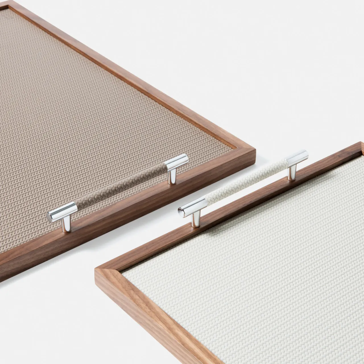 Elegante e funzionale, questo raffinato vassoio poggia su una struttura pieghevole a forma di X in noce e presenta un piano rimovibile con una superficie in pelle bianca e maniglie laterali in cromo lucido. La texture ricca ed elegante della pelle conferisce a questo pezzo un fascino distintivo. Perfetto accanto a un divano o a una poltrona per appoggiare bevande, libri e dispositivi di intrattenimento, il piano può essere utilizzato come vassoio separato per le feste in ogni occasione. Questo tavolo è disponibile anche in una dimensione più piccola e con maniglie in ottone spazzolato. La pelle può essere personalizzata in altri colori; per maggiori dettagli, contattare il Concierge.