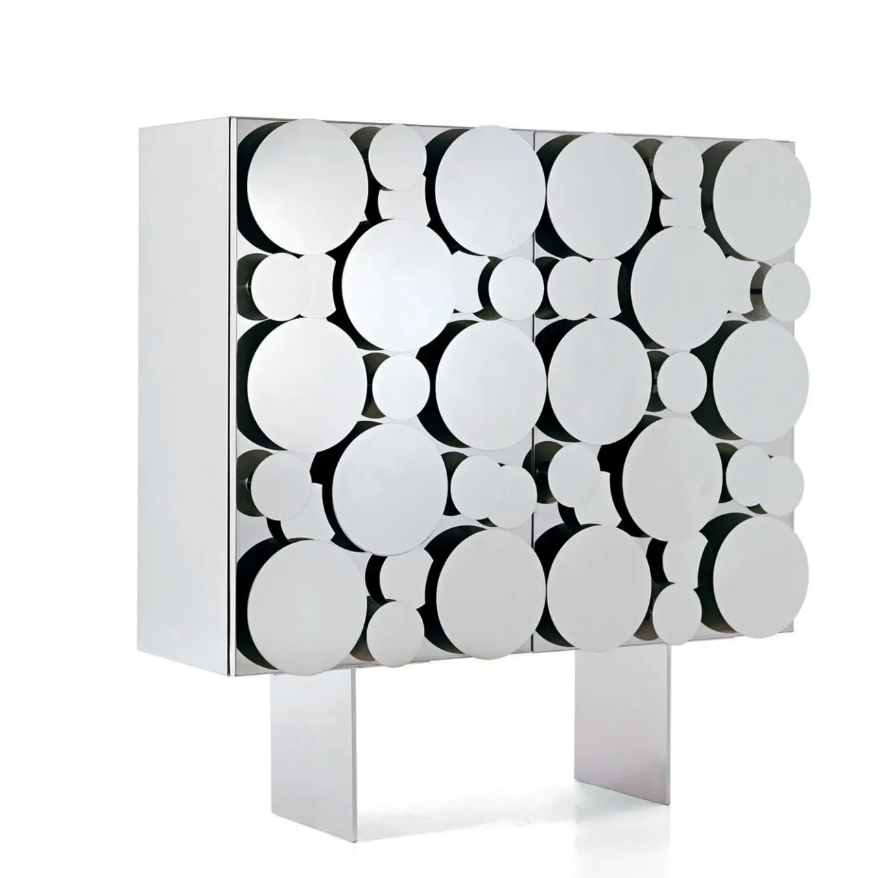 Questa dispensa di grande effetto è realizzata con una combinazione particolarmente resistente di fibre di legno e resina pressata ad alta temperatura. È rifinita in lacca rosa e presenta un mobile con due ripiani in cristallo all’interno. La struttura è in acciaio inox con un motivo geometrico di cerchi in acciaio che aggiunge consistenza alla parte anteriore del pezzo. Richiede il montaggio.
