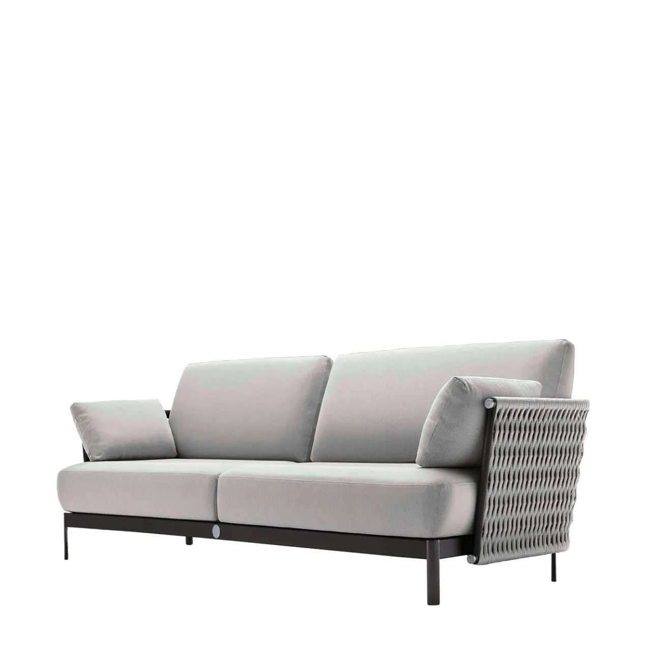 Questo divano a 2 posti è disponibile in tessuto speciale trattato o in pelle di prima scelta. Imbottitura dei cuscini in dacron impermeabile. Struttura in combinazione di metallo nero satinato trattato in cataforesi con logo Giorgio Collection inserito e corde intrecciate grigio chiaro. Speciale copertura per esterni inclusa nel prezzo. Design di Castello Lagravinese Studio.