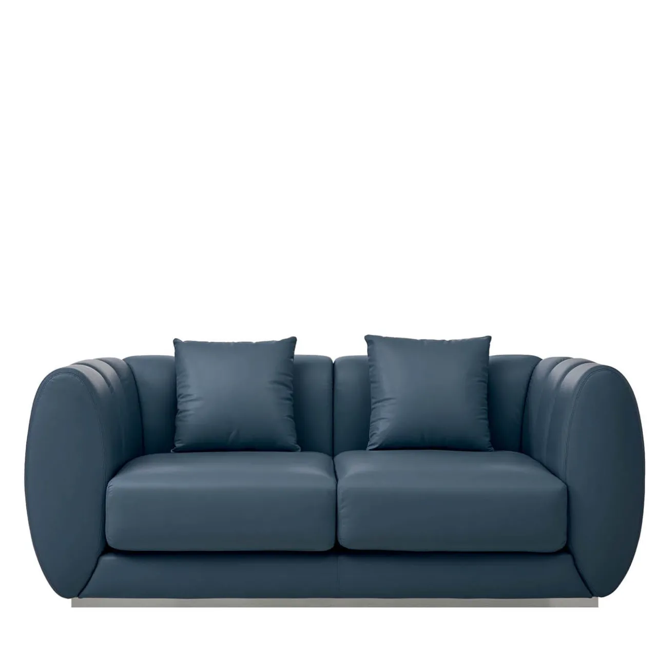 Un trionfo di volumi pieni, progettati per offrire un comfort impeccabile, caratterizza questo letto matrimoniale compatto come complemento ideale per interni moderni ed eleganti con particolari esigenze di spazio. Proposto in una regale tonalità blu, la pelle pregiata avvolge la struttura, i cuscini e gli elementi laterali sporgenti, che conferiscono al pezzo una qualità giocosa. Una base a zoccolo in nichel completa il design.