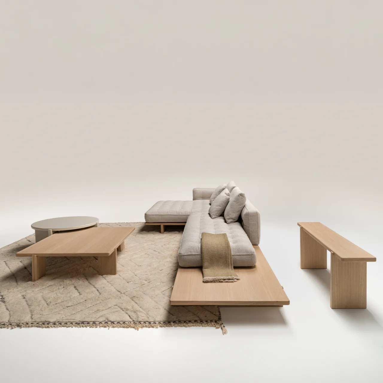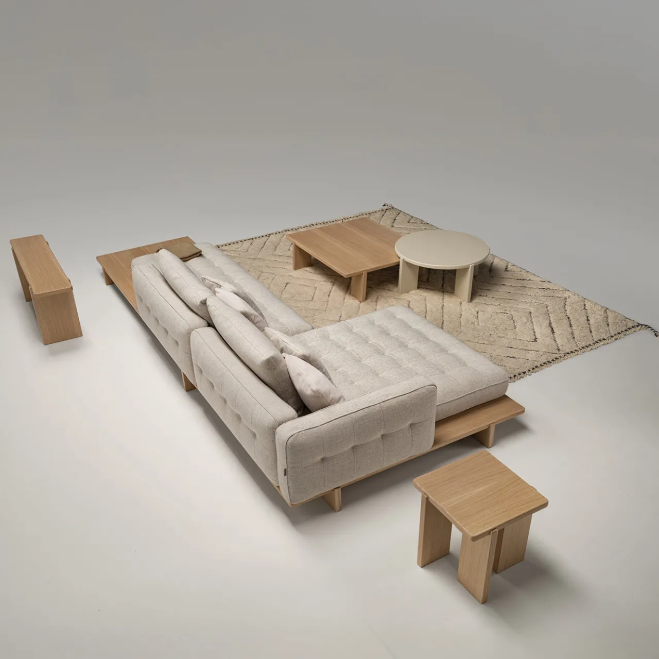 Questo ampio divano ad angolo presenta un’elegante base in legno con finitura naturale. L’imbottitura beige offre una superficie morbida e accogliente con cuscini di seduta trapuntati e diversi cuscini per la schiena per un maggiore comfort. Progettato per la versatilità, è disponibile in varie opzioni di tessuto e configurazioni per adattarsi a diversi spazi abitativi. La piattaforma in legno estesa fornisce spazio extra per decorazioni o accessori per il relax. Cuscini decorativi non inclusi.