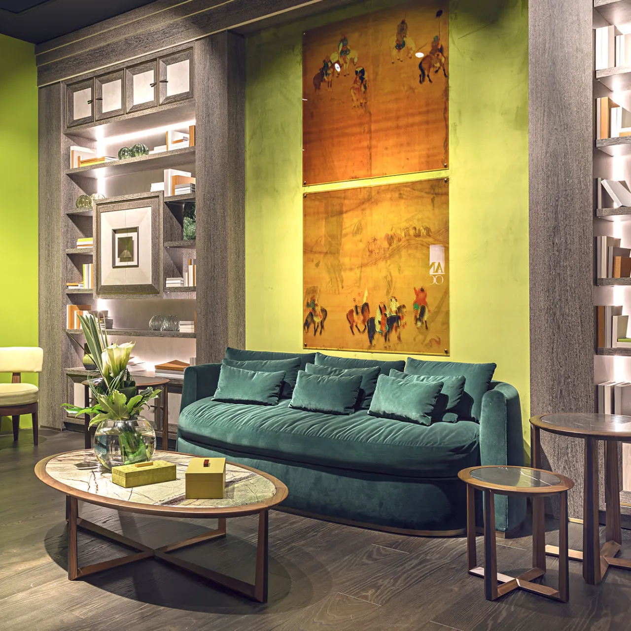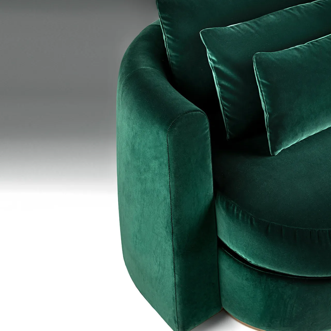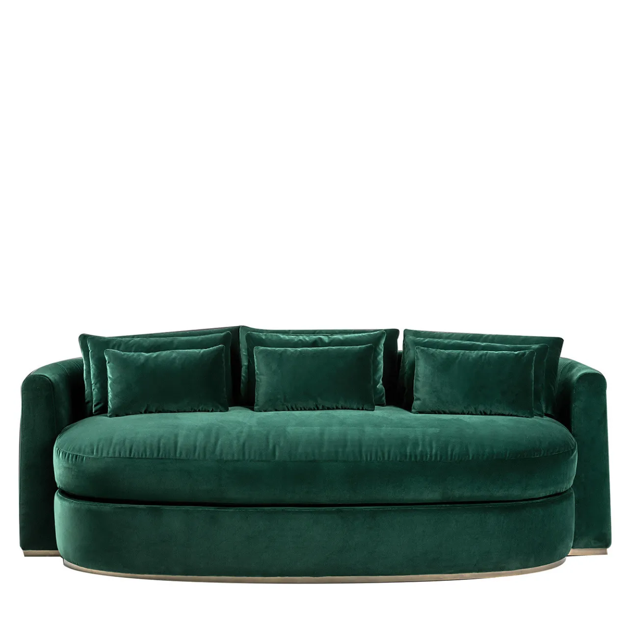 Il valore estetico che definisce questo superbo divano infonderà a qualsiasi arredamento moderno una raffinatezza senza pari. Una struttura profondamente curva abbraccia strettamente l’ampia seduta ovale, offrendo la giusta quantità di sostegno per lo schienale e i braccioli. La seduta generosamente imbottita offre il massimo comfort, rendendo questo design in legno completamente rivestito in tessuto color smeraldo un luogo incantevole dove rilassarsi. Una base in bronzo completa sottilmente il pezzo.