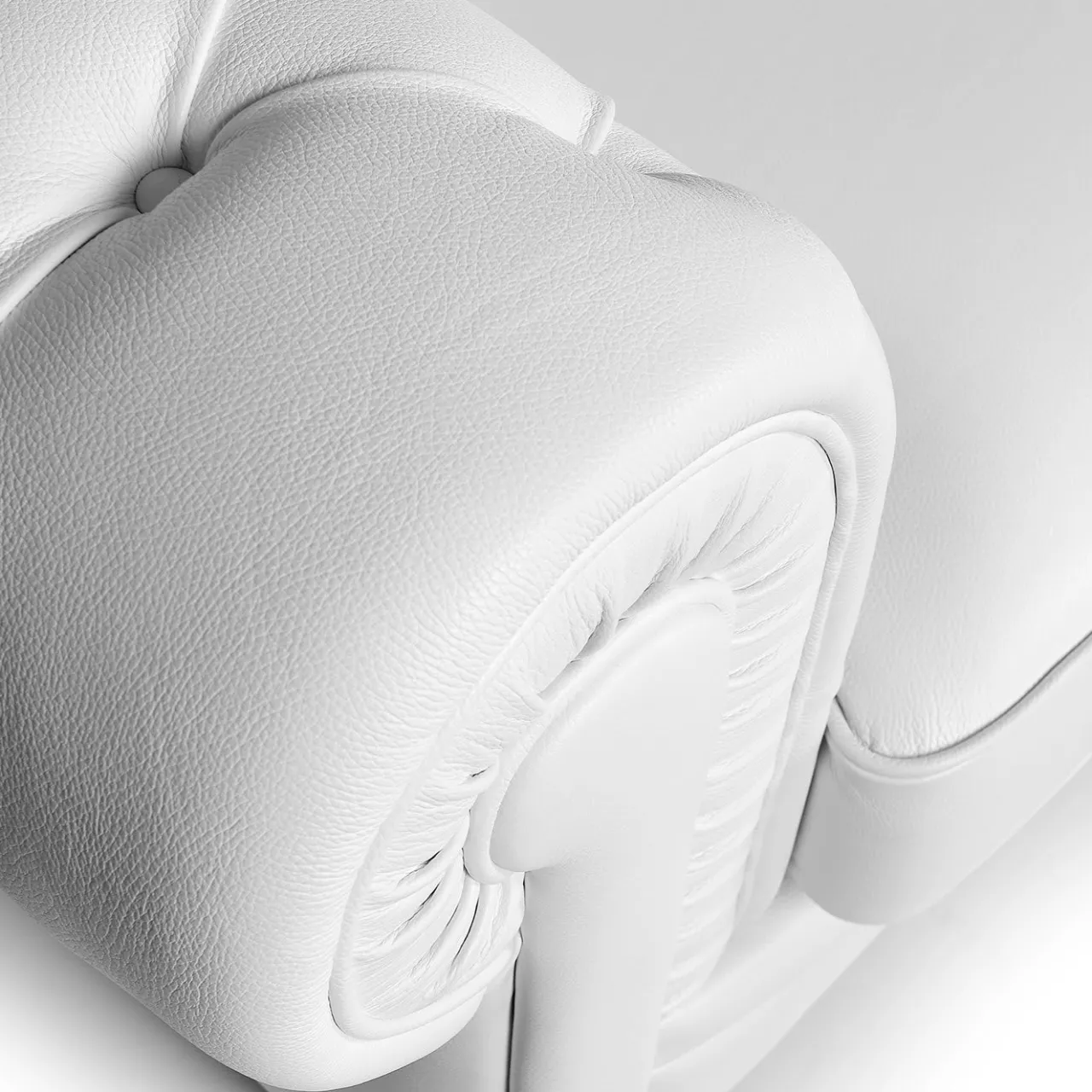 Questo design elegante e senza tempo sarà una scelta azzeccata per completare gli arredi total white o per aggiungere un accento di luminosità a quelli monocromatici. Interamente rivestita in pelle nabuk bianca, la struttura in legno è realizzata all’80% in faggio e al 20% in abete, con una base alta 5 cm in faggio. Lo schienale e i braccioli, che presentano un profilo rotondo, sono impreziositi da uno splendido motivo capitonné. L’imbottitura è in poliuretano ad alta densità e fibra di poliestere.