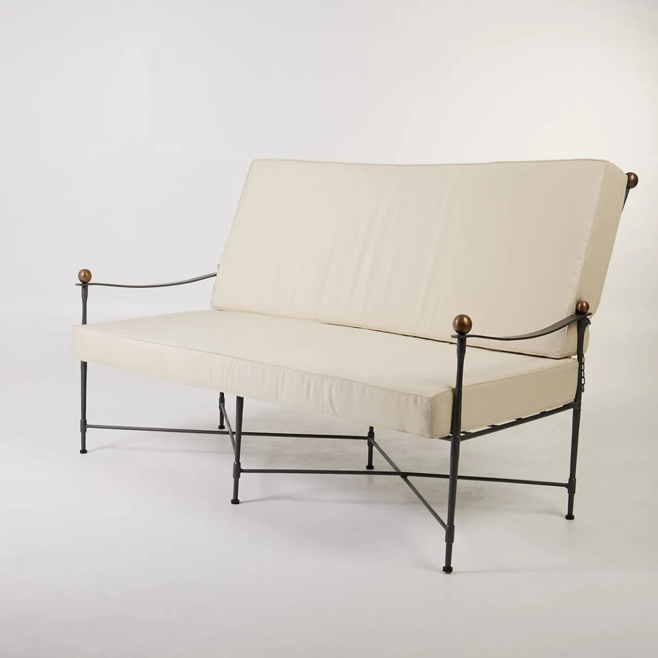 Un’accattivante struttura in ferro a trama incrociata – zincata a caldo e verniciata a fuoco in grigio grafite – incontra in questo divano da esterno il massimo comfort di uno schienale reclinabile e di una cuscinatura beige. Ideale per un giardino o un portico, il suo luminoso e morbido rivestimento (Sunbrella “Canvas”) può essere facilmente rimosso e garantisce resistenza all’acqua e alle macchie. I pomelli in ottone brunito sigillano il design.