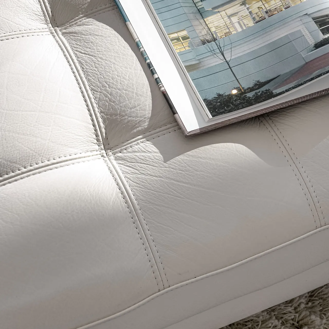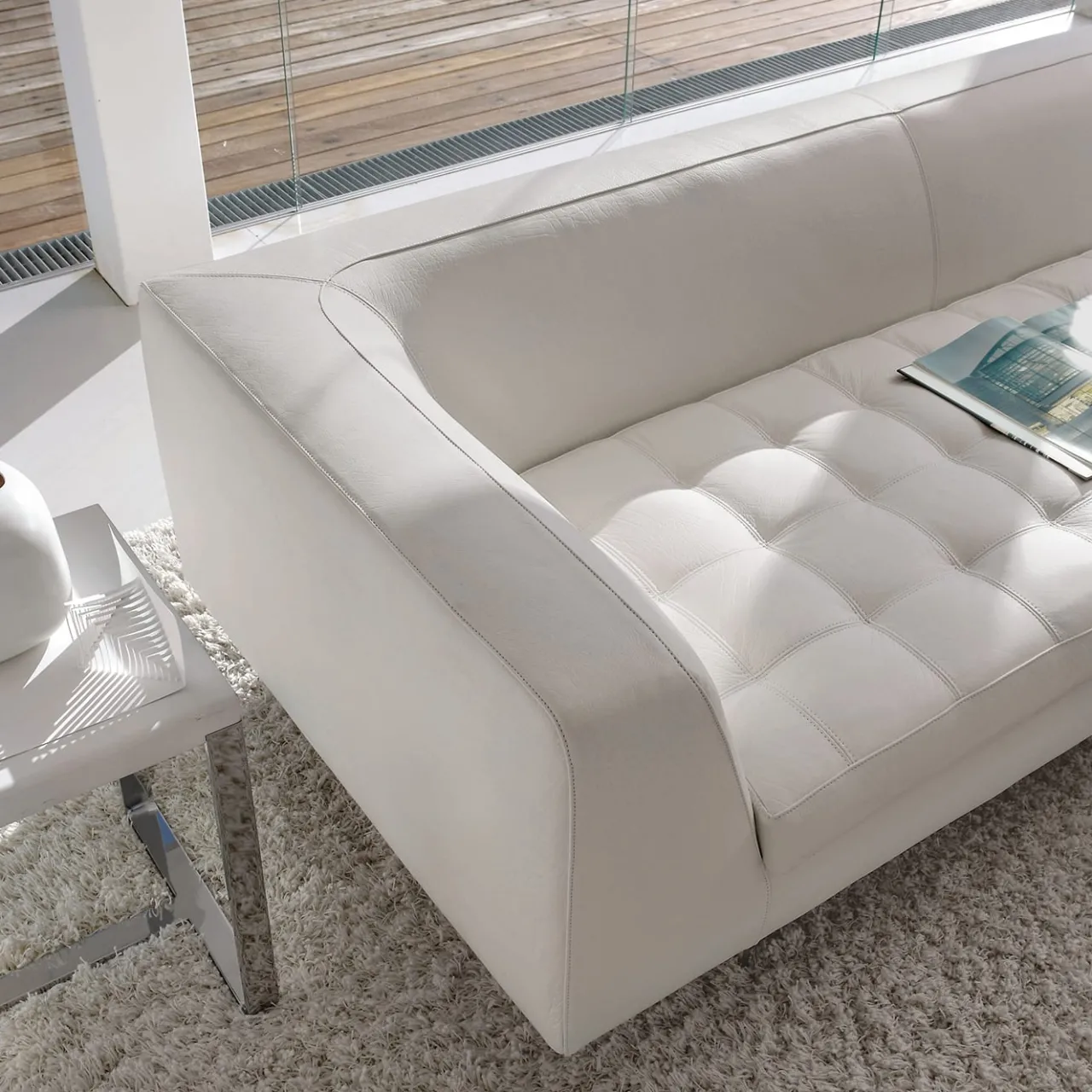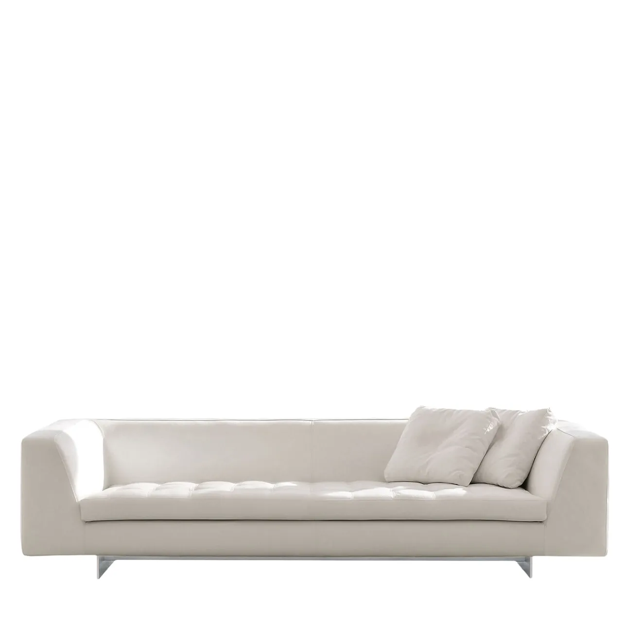 Tanto rigoroso nella sua silhouette lineare quanto etereo nel suo luminoso look total white, questo divano irradia pura raffinatezza contemporanea. La base in alluminio goffrato trasmette un senso di leggerezza visiva, controbilanciando i volumi della scocca, che combinano una ricca schiuma poliuretanica a più densità con un pregiato rivestimento in pelle bianca per una perfetta morbidezza e una piacevole sensazione tattile. I cuscini sciolti coordinati completano il pezzo. Consultare il Concierge per le varianti disponibili.