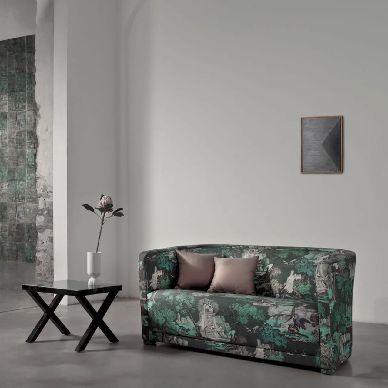 Sofisticati elementi architettonici che punteggiano un colorato scenario bucolico descrivono il prezioso tessuto che avvolge completamente questo divano esclusivo e compatto. Le sue dimensioni compatte e il design avvolgente sono un invito al relax o a sedersi per condividerlo con una persona speciale. Perfetto per adattarsi a un piccolo spazio abitativo o a un angolo di relax in un elegante studio privato.