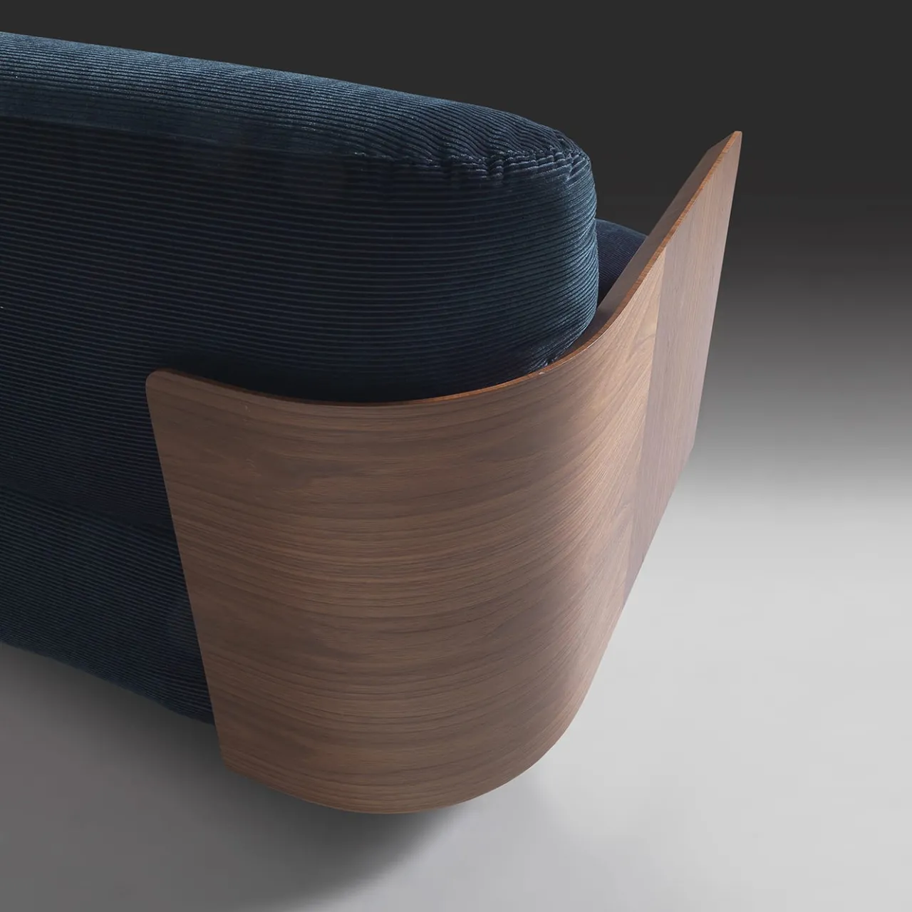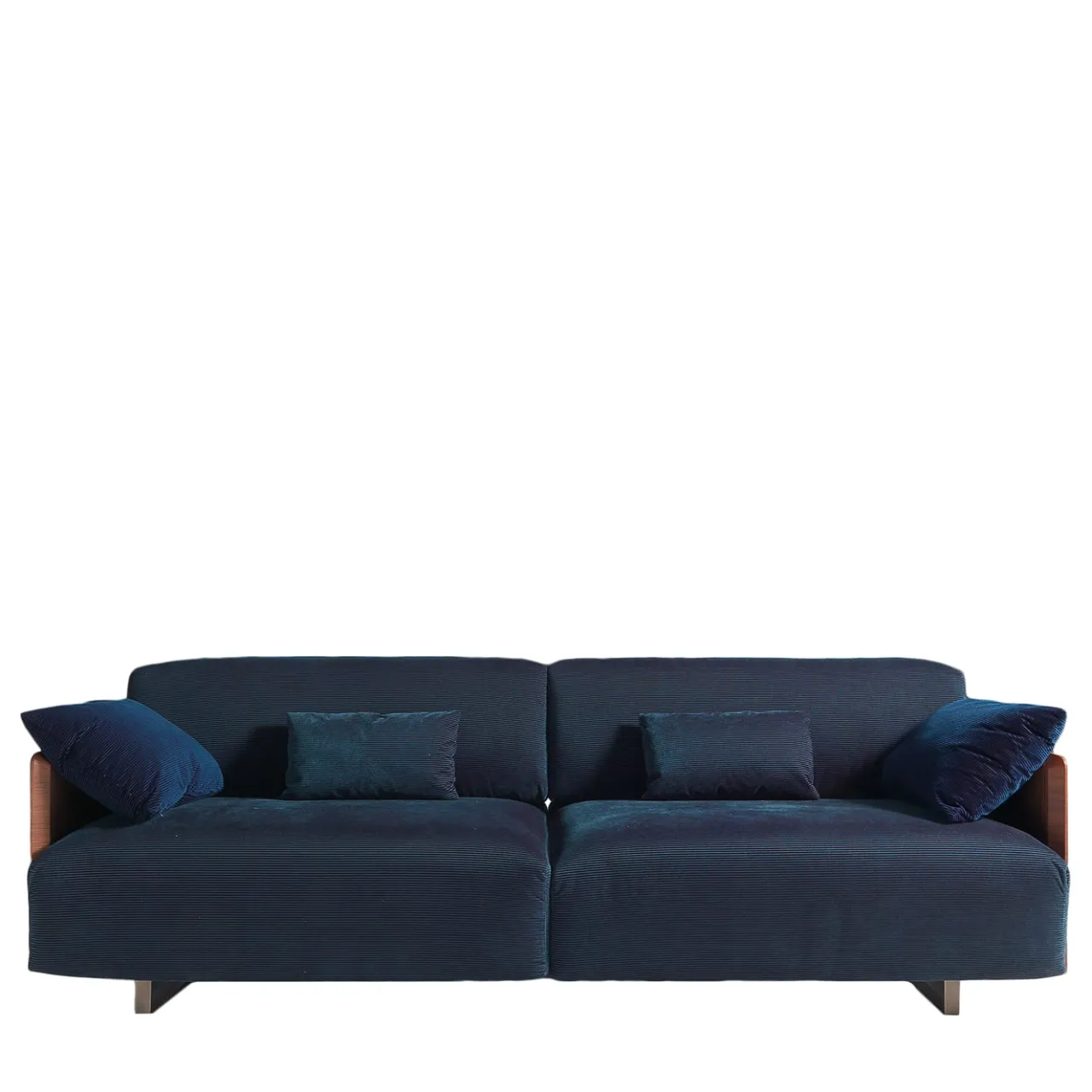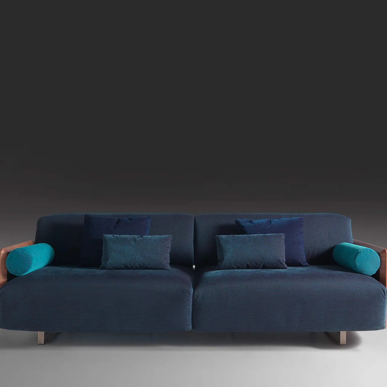 La sapiente tradizione artigianale incontra il design contemporaneo in questo splendido divano, realizzato a mano in legno di noce canaletto con fianchi completamente in legno. Arricchito da due piccoli cuscini cilindrici che fungono da braccioli, è rivestito con un affascinante tessuto blu. Questo pezzo è disponibile anche nella versione bianca. Su richiesta sono disponibili altri cuscini decorativi. Per ulteriori informazioni, contattare il Concierge.
