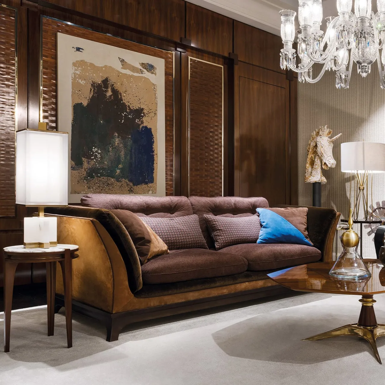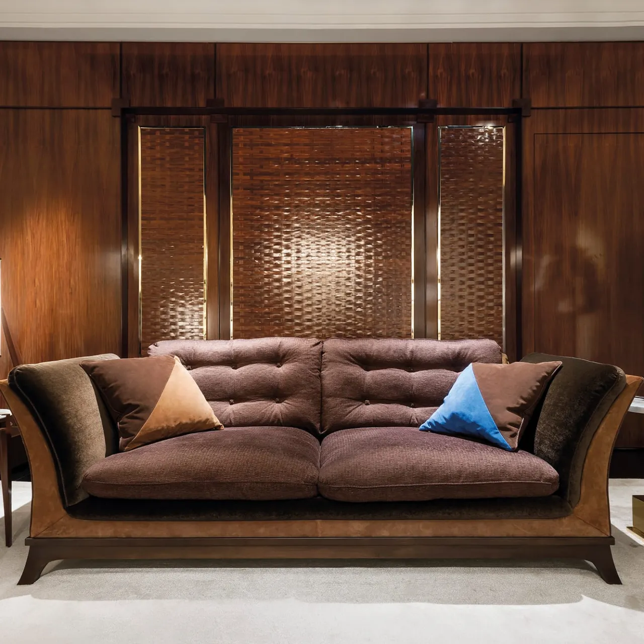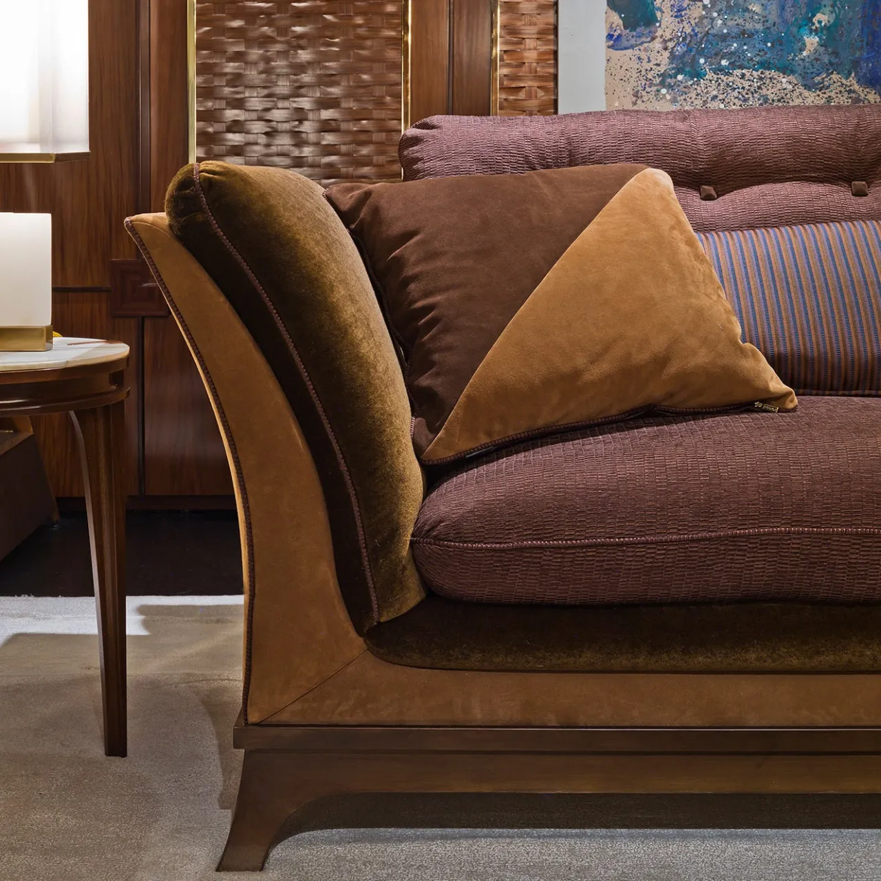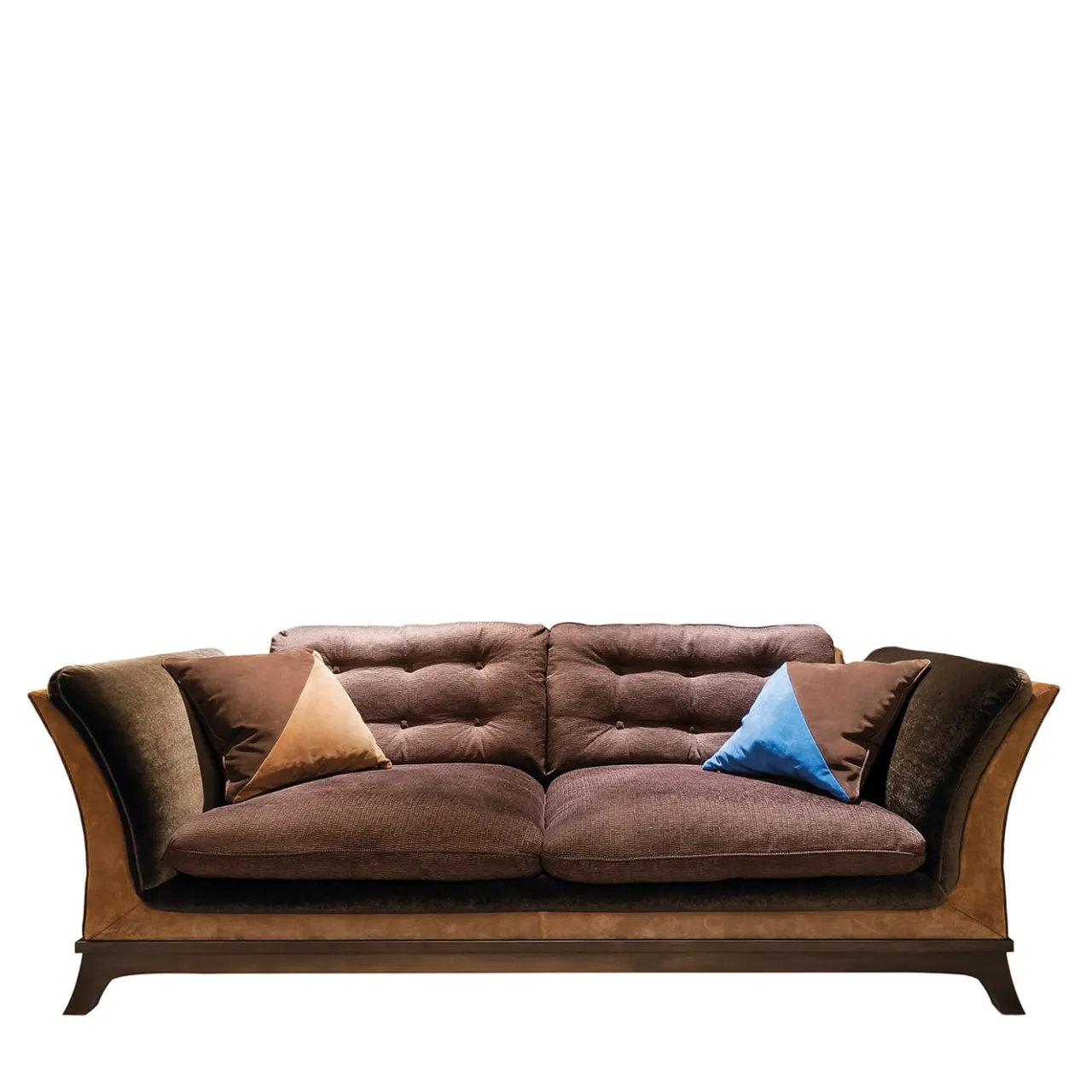 Straordinaria combinazione di rivestimenti di prima qualità, questo splendido divano a tre posti combina ciniglia, velluto mohair e pelle scamosciata in un design assolutamente elegante definito da un’intramontabile tavolozza di marroni. Realizzato a mano in legno laccato, include due cuscini. Per ulteriori informazioni, rivolgersi al Concierge.