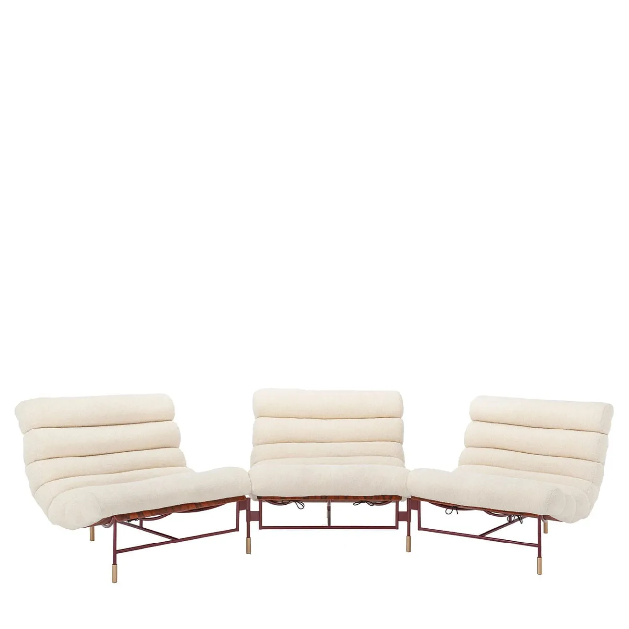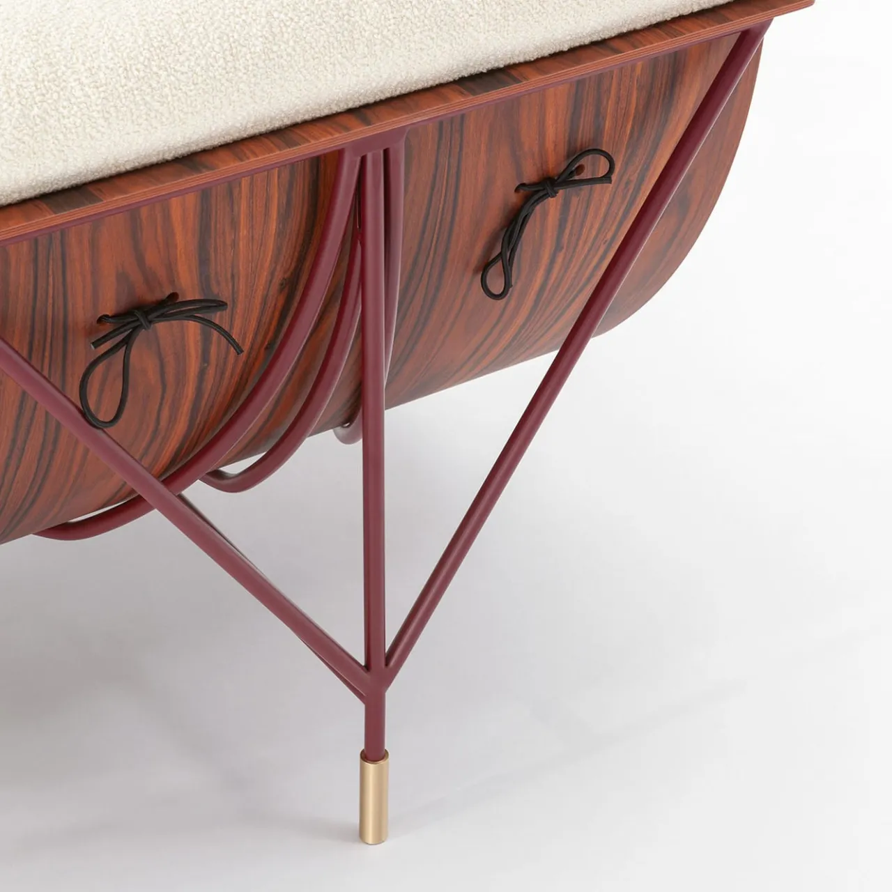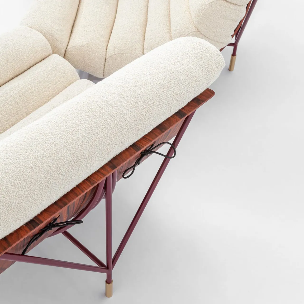 Nuvola è una futuristica seduta tripla dal sapore vintage per un salotto contemporaneo: le sedute ruotano su due assi in modo da poter funzionare in qualsiasi contesto architettonico. La struttura in ferro, con piedini in ottone, ha profili a S dalle dimensioni minime. La scocca, in palissandro Santos, naturale o tinto scuro, rende omaggio al lavoro di Sergio Rodrigues e Percival Lafe, seguendo nella forma la struttura metallica sottostante, un dettaglio che rende questo pezzo di design unico e inconfondibile.