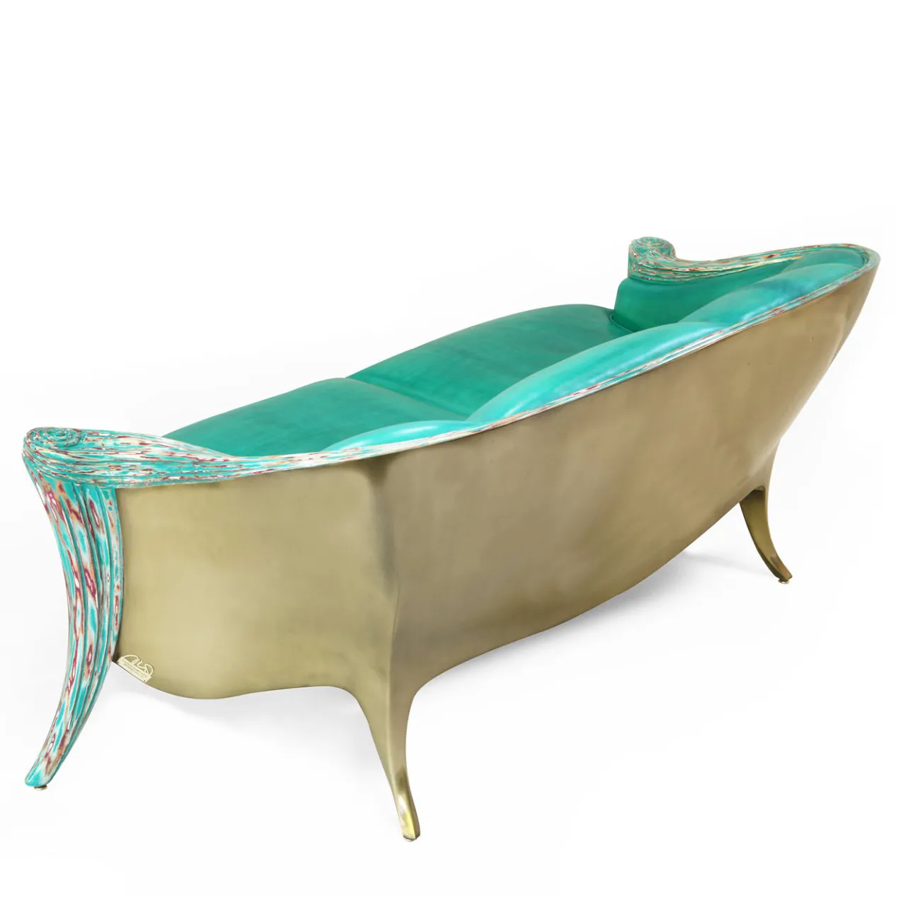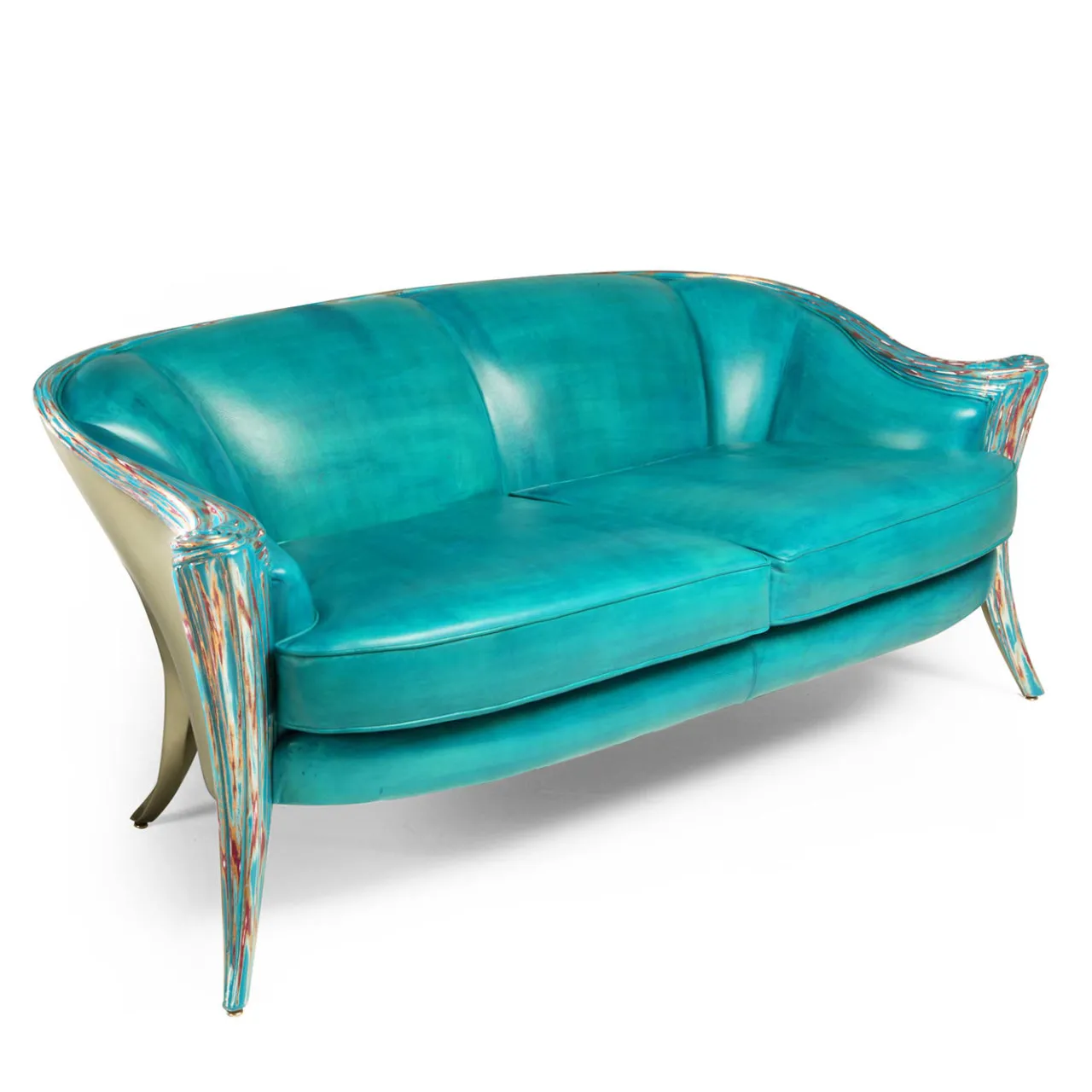 Questo splendido divano fa parte della collezione Opus Futura, una serie di sedute eclettiche che si inseriscono con eleganza in un ambiente moderno o contemporaneo. In questo caso, questo divano a due posti vanta una struttura in legno con finitura metallica Champgold (una vernice contenente oltre il 95% di metallo). Le gambe anteriori intagliate, che fanno anche da cornice allo schienale curvo, sono impreziosite dalla finitura Crazy Glass che conferisce loro un effetto dinamico unico nel suo genere. Il rivestimento in pelle è in un sofisticato tono di blu turchese. Disegnata da Carlo Rampazzi.
