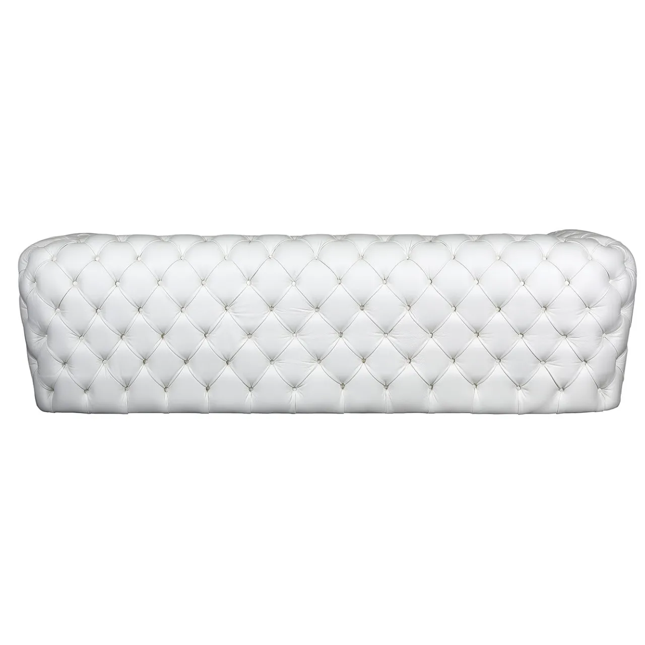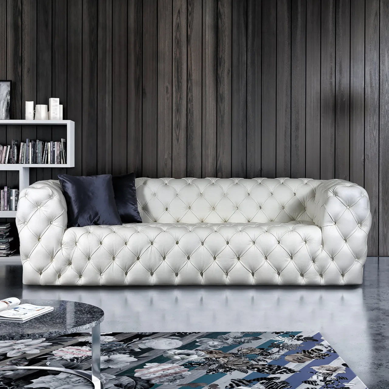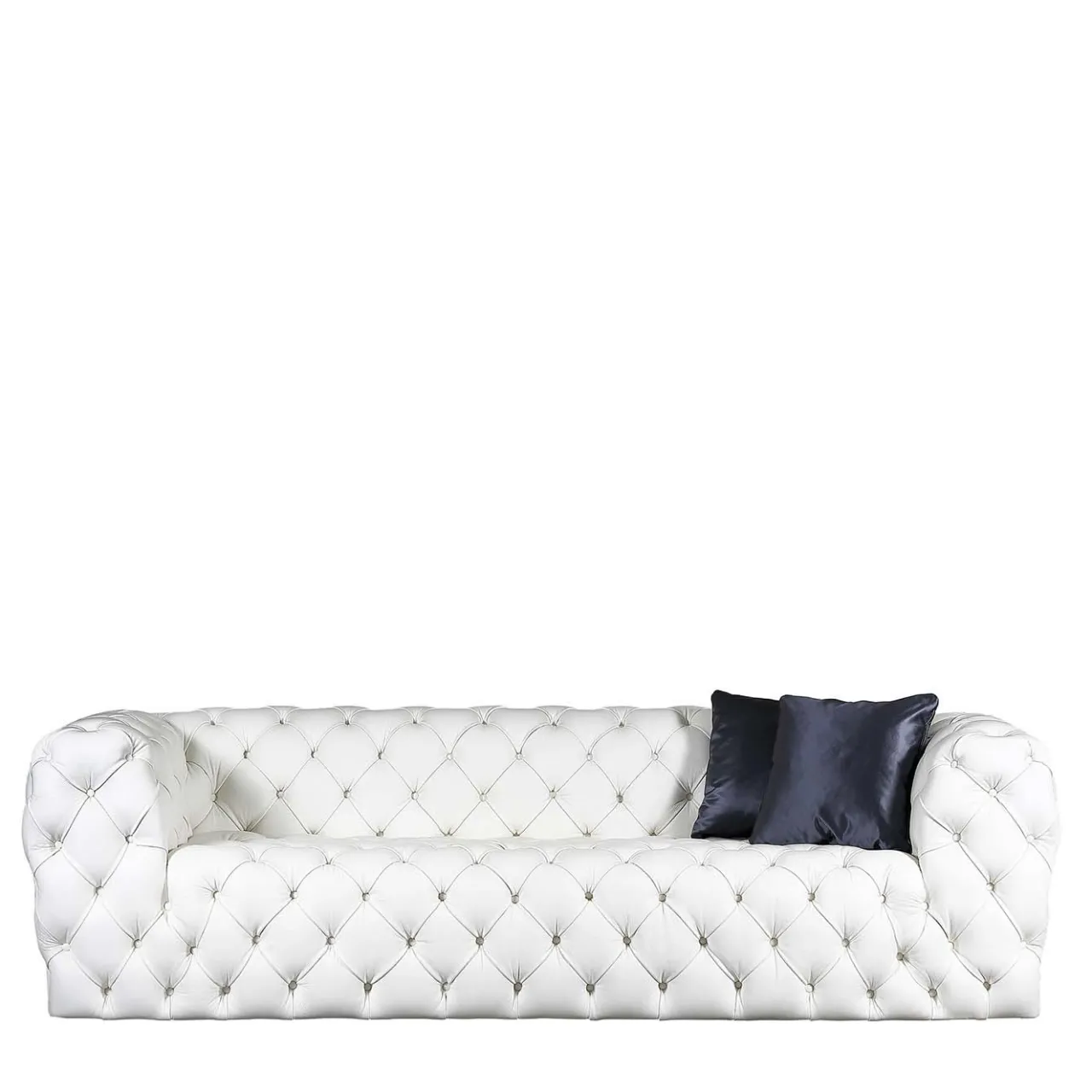 Questo squisito divano emana pura eleganza. L’ampia seduta sembra essere ritagliata dalla struttura rettangolare, realizzata in compensato e generosamente imbottita con l’85% di poliuretano e il 15% di fibra di poliestere. Un disegno capitonné magistralmente eseguito abbellisce la pregiata pelle naturale in una sfumatura eterea utilizzata come rivestimento per l’intero pezzo. Una base in metallo alta 5 cm completa questo design di lusso.