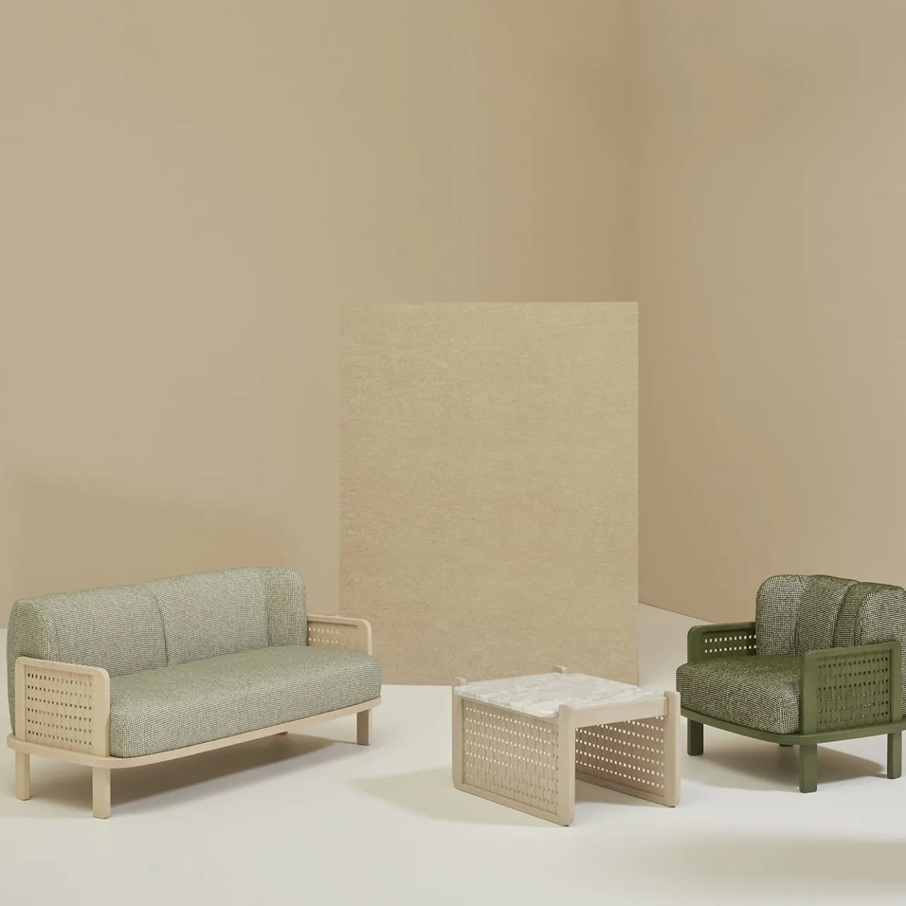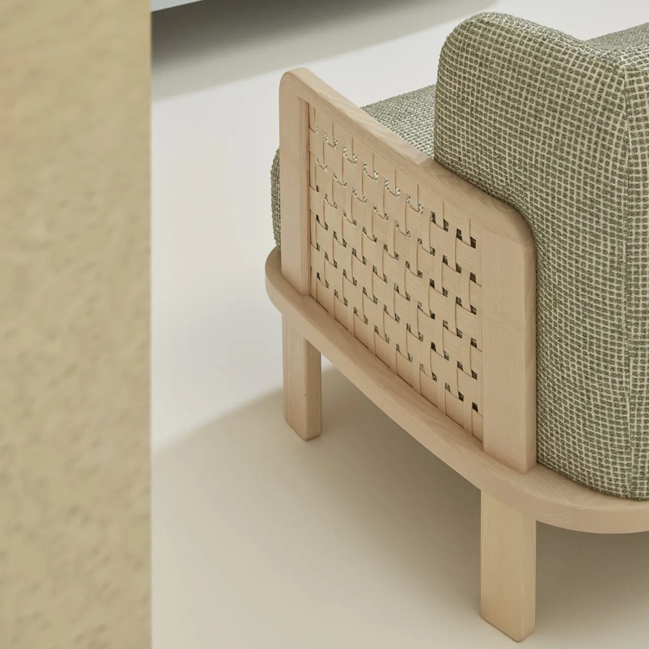 Una robusta struttura in frassino sbiancato che si distingue per un disegno traforato di ispirazione wicker sui lati caratterizza questo esclusivo divano di Cristina Celestino. Caratterizzato da una forma leggermente avvolgente, lo schienale imbottito condivide con la seduta abbondante lo stesso rivestimento in tessuto testurizzato di colore verde (Brionne 2863). Per le poltrone e i tavolini, consultare il catalogo Artemest.