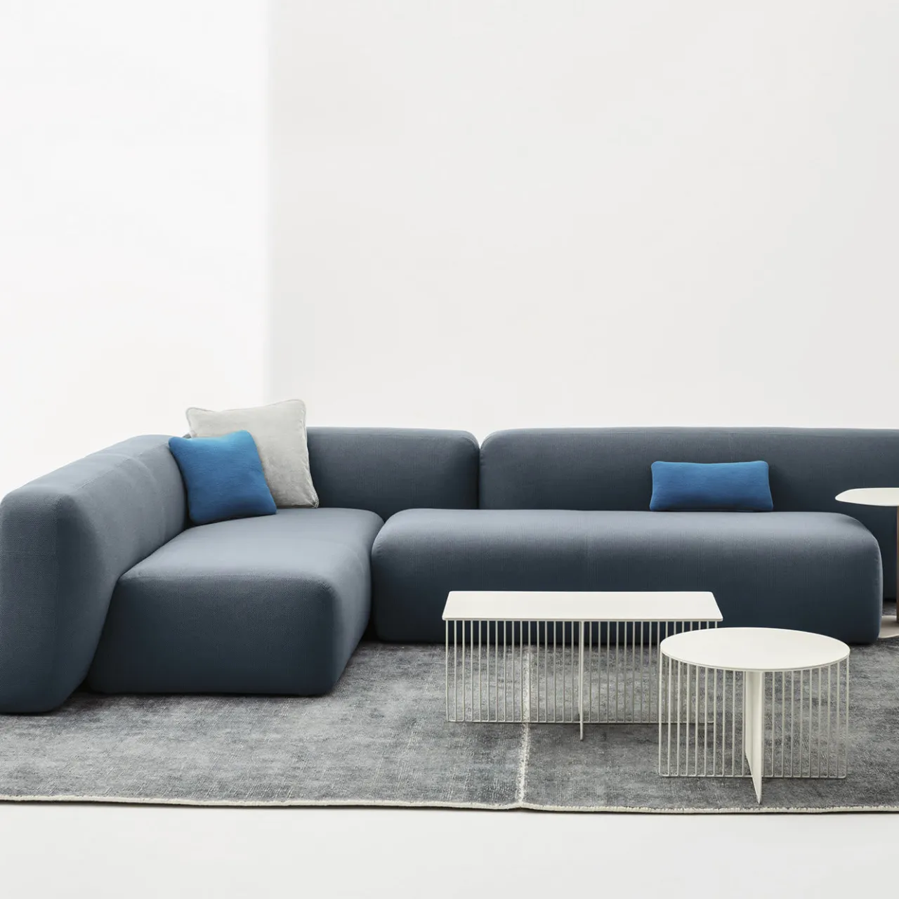 Questo divano fa parte di una collezione di sedute imbottite ispirate all’arte giapponese di disporre le pietre, da cui prende il nome. I moduli vantano volumi essenziali di ispirazione organica, disposti in armoniose composizioni sfalsate. Scultoreo e liscio, questo pezzo presenta una struttura in frassino massiccio, abete massiccio e un pannello in masonite. L’imbottitura è in poliuretano ignifugo e indeformabile a densità differenziata con fibra di poliestere. Il rivestimento in tessuto blu petrolio è sfoderabile su richiesta.