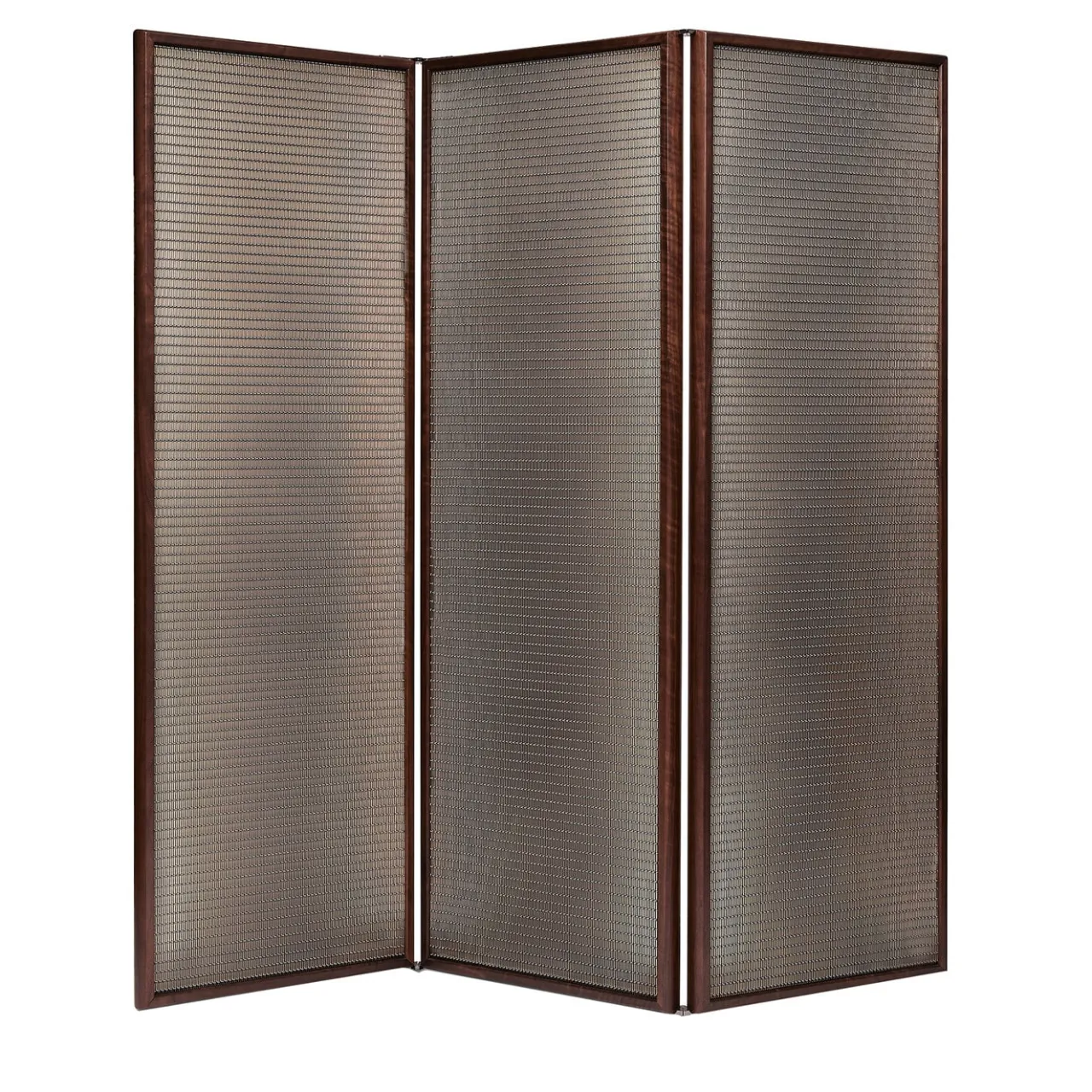Ronin è un divisorio artigianale italiano a tre ante. La caratteristica principale è il sistema di illuminazione integrato: ogni porta è costituita da un pannello a LED con un colore di 2700 kelvin per garantire un’atmosfera calda. Le fonti di luce corrono parallele ai lati verticali del telaio di ciascuna porta, creando un effetto sfumato. Il paravento è delineato da un massello di noce e ogni porta è contrassegnata da una griglia metallica intrecciata ispirata alle armature dei giapponesi. Misure del singolo pannello: 60x5x180h.